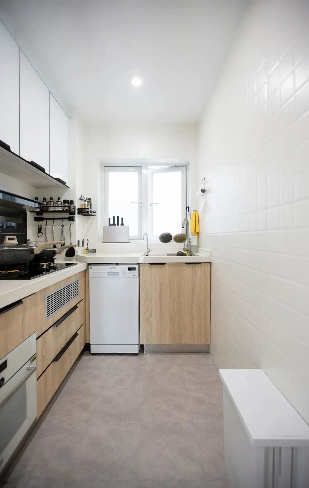 L型的厨房设计,使动线更为灵活,洗碗机、蒸烤箱、集成灶、垂直收纳...一应俱全,不同收纳柜满足多样收纳需求。