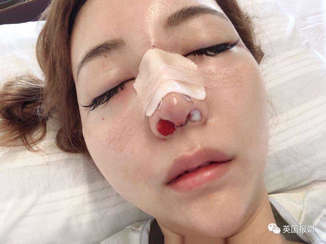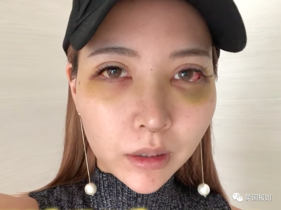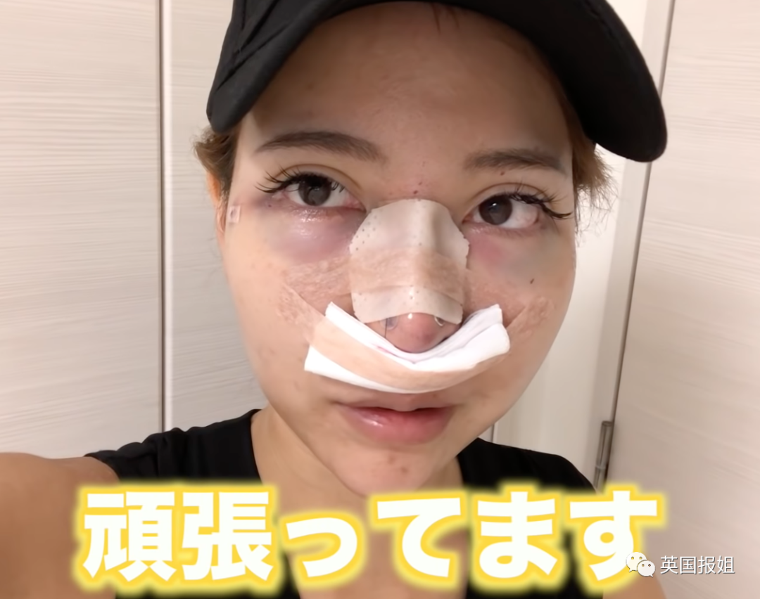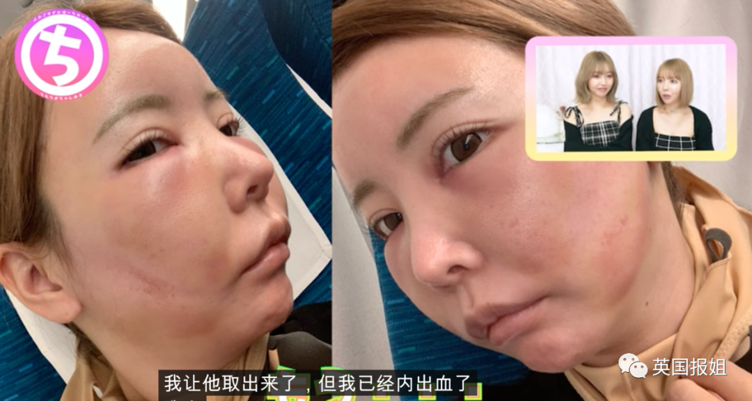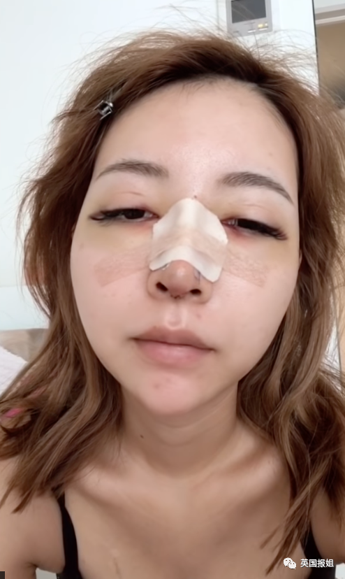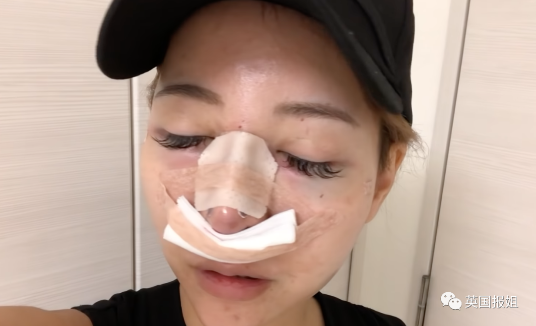 做完软骨隆鼻手术后,眼睛乌青,被取出一块软骨的地方疼到每天都哭(千佳说这是她做过最疼的手术)。