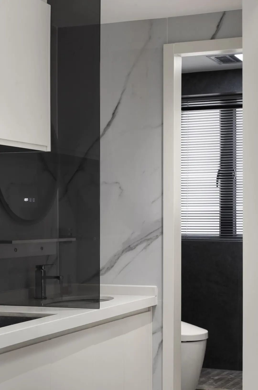 ▲厨房是开放式的格局,与餐厅之间还加入了一个中岛台+吧椅的组合,布置了一个情调优雅的小区域;厨房整体白色橱柜+墙面,加深灰色地面,整个空间显得更加干净时尚;虽与简约的玄关、客厅区域有着明显的风格差异,但在吧台的过渡下,整个空间也给人一种现代舒适的气息。