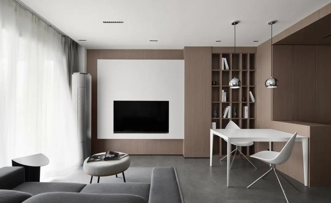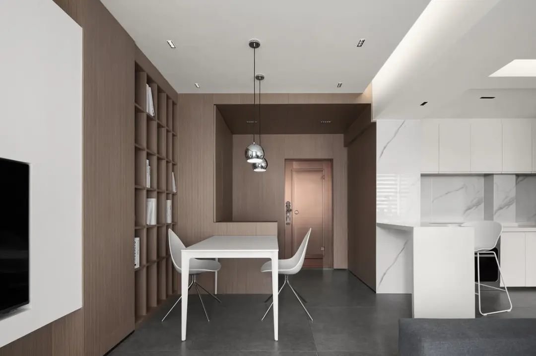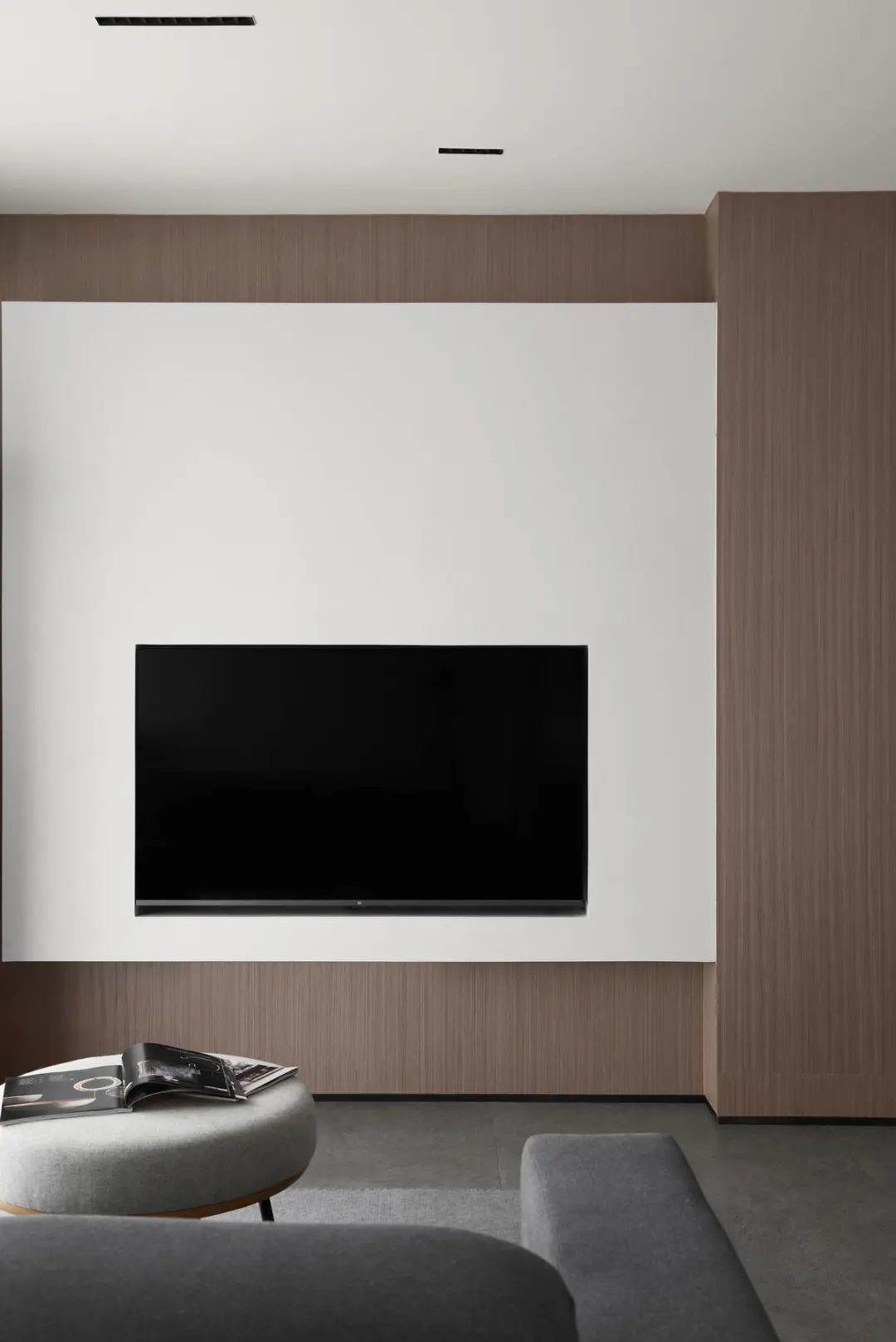 ▲由于面积关系,所以把客厅与餐厅做成同一个空间下,电视墙在木饰面墙面的基础,中间加入一个白色的背景+壁挂电视机,右侧加入开放式的书架摆上书籍,让客厅空间充满简约文艺的舒适感。