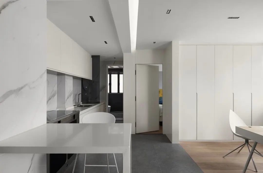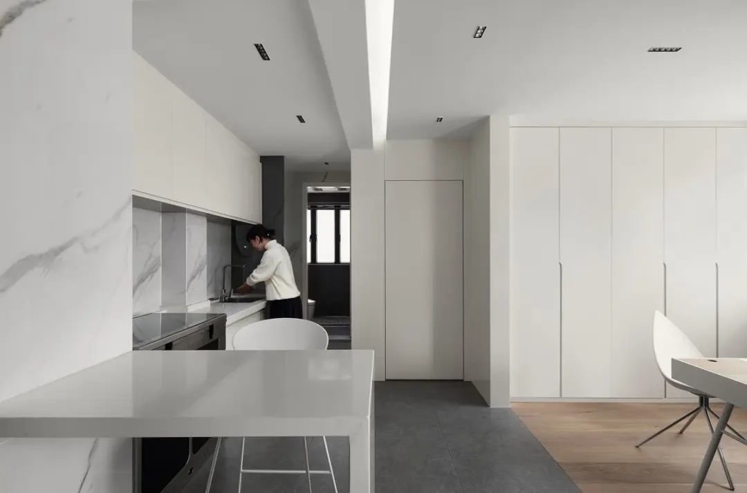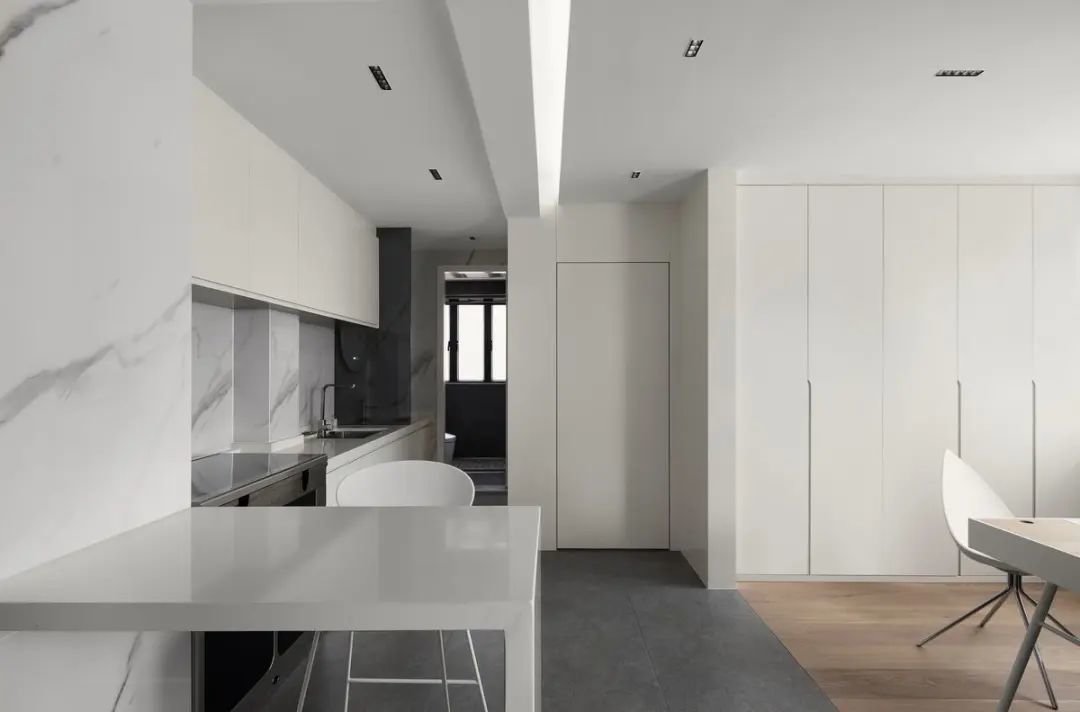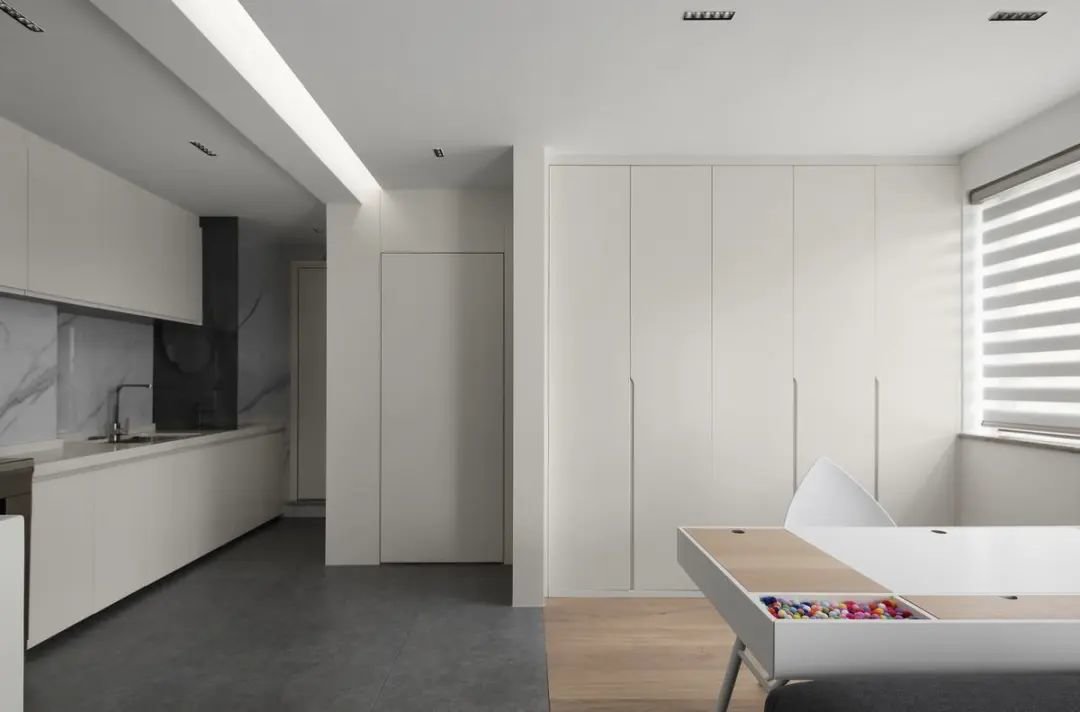 ▲厨房里面是卫生间、卧室区域,卧室门是隐形门的设计,简洁白色的方面与墙面、定制柜保持统一的质感,空间风格和谐自然。
