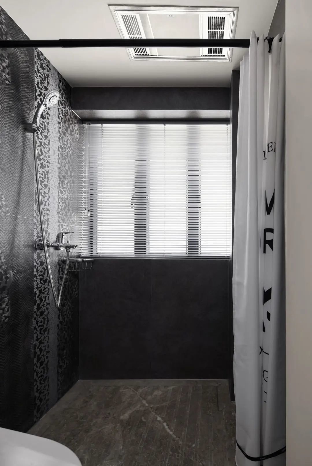 ▲卫生间内部面积不大,以浴帘作为干湿分离的隔断,增设暗色的的卫浴空间,加上拉槽处理的地面,让卫浴空间简单而实用方便。