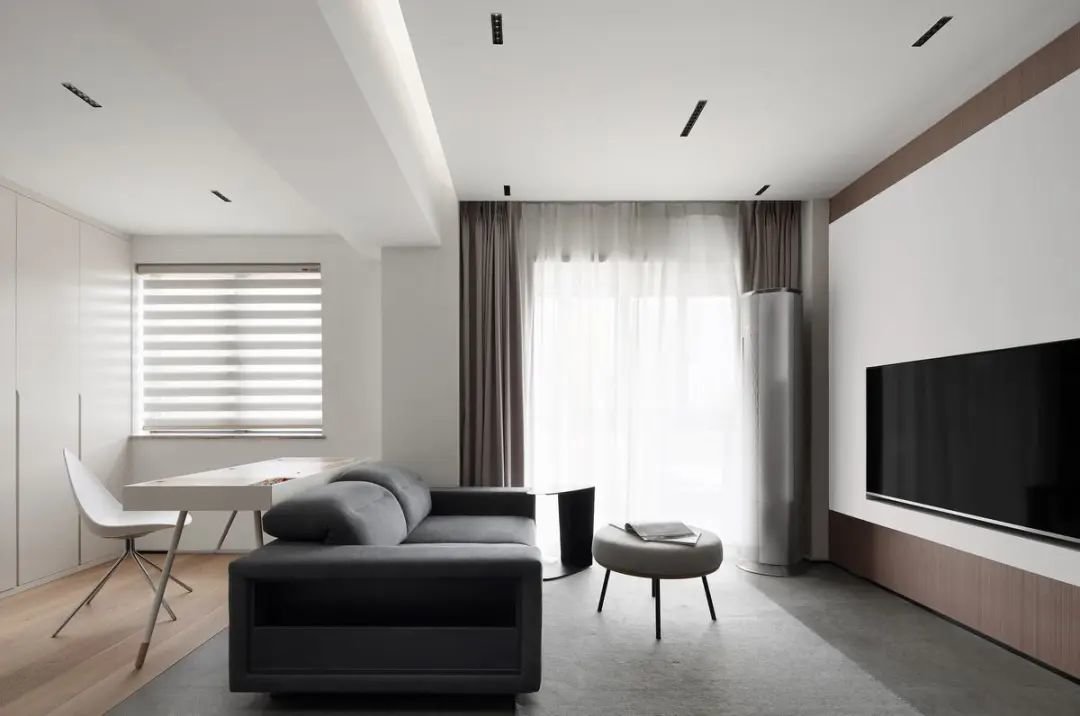 ▲沙发后方就是办公区,一张书桌靠着沙发布置,窗户是纱帘设计,简约的空间没有什么多余的布置,实用舒适为主。