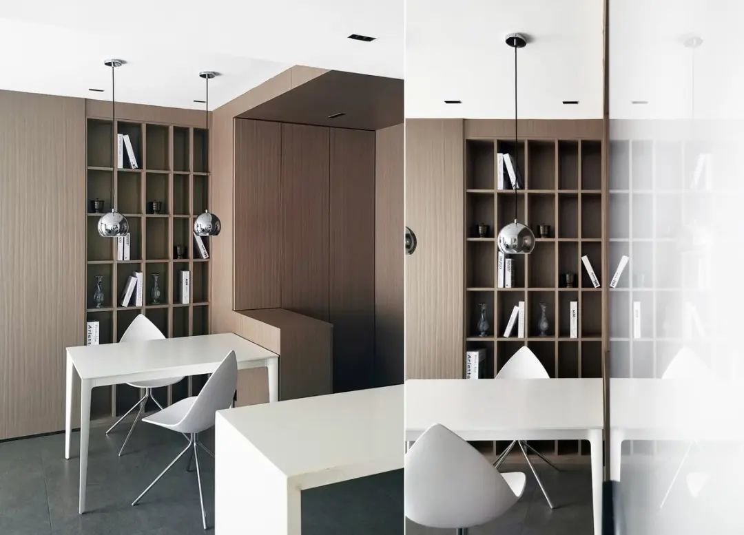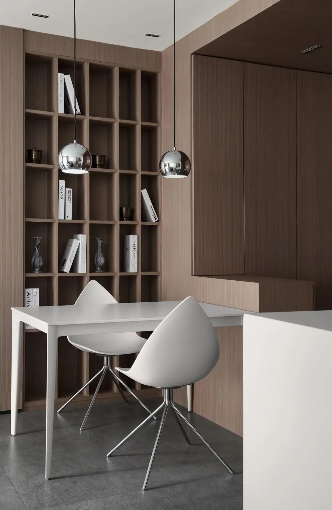 ▲餐桌椅后方开放式的书架,摆上书籍、装饰品,餐桌上方还有两盏银色的球形吊灯,为主人布置了一个简约精致的用餐仪式感。