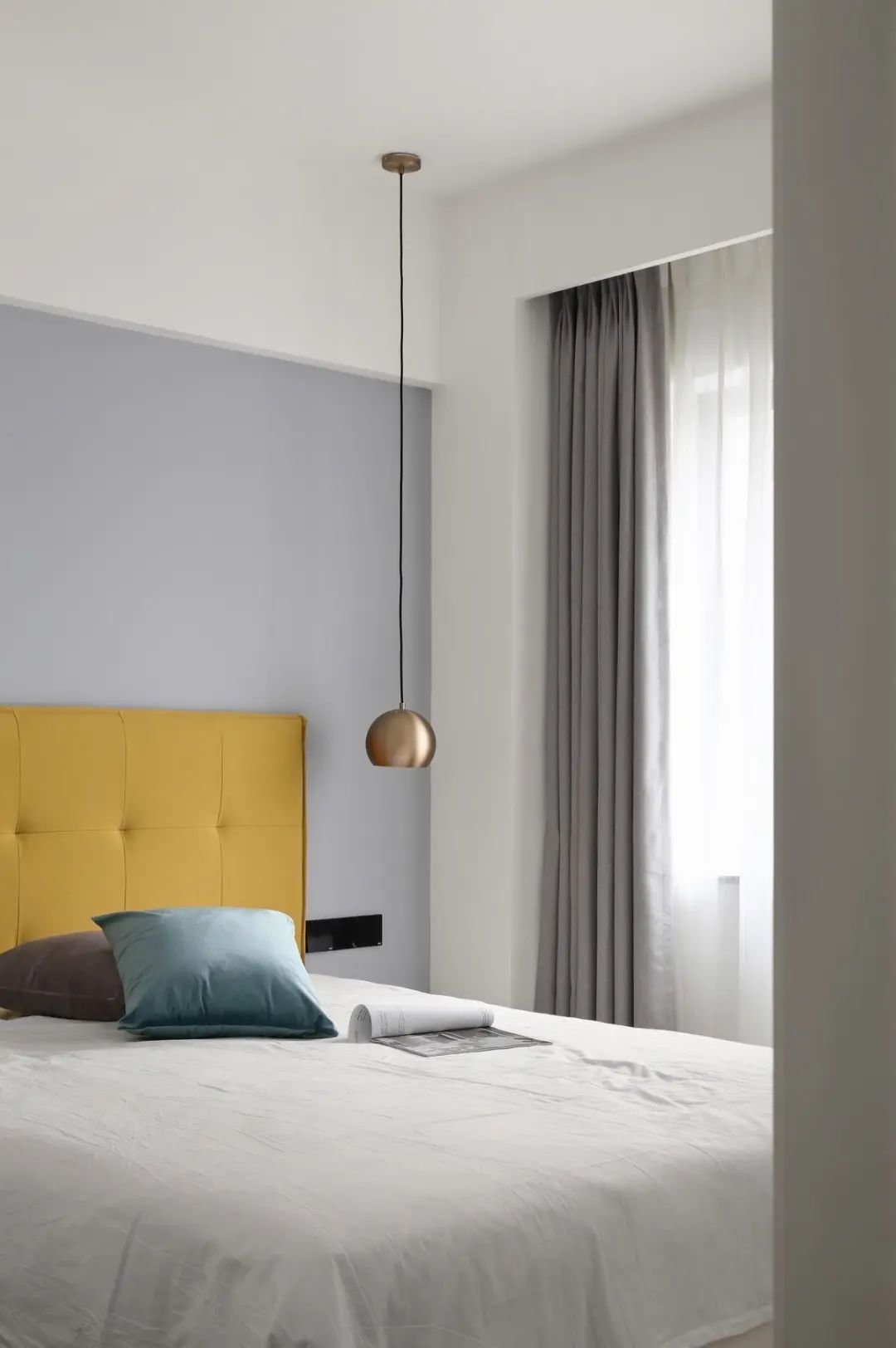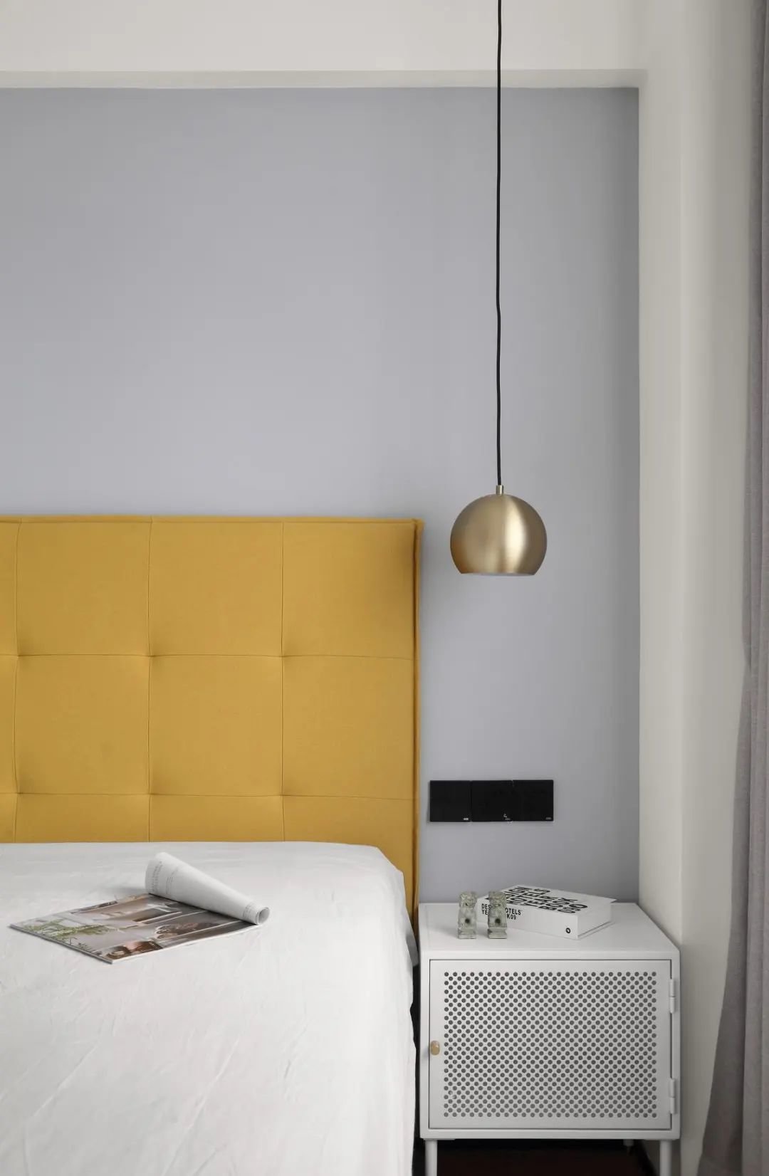 ▲卧室以紫蓝色的床头墙+黄色皮艺靠背的床铺,搭配净白干净的床单,浅灰色的窗帘+纱帘,让卧室显得简约舒适,同时黄色的床靠背也使得卧室有了一种活力的俏皮感。