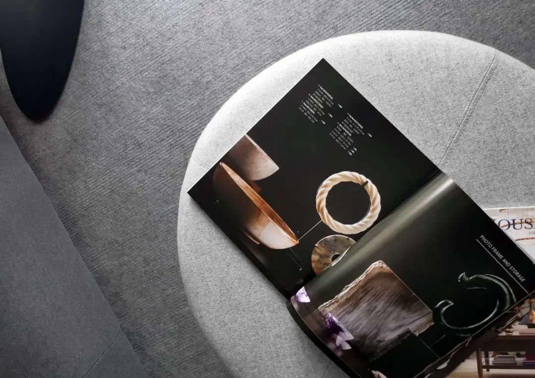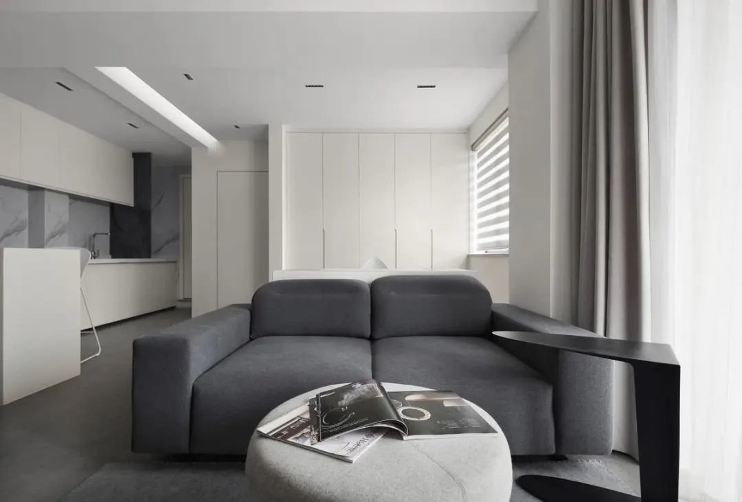 ▲灰色地砖+灰色布艺沙发,搭配白色与木质感,给人一种简约舒适的温馨;还有一个灰色圆形的布艺小凳充当茶几功能,让小客厅的功能更加灵活实用。