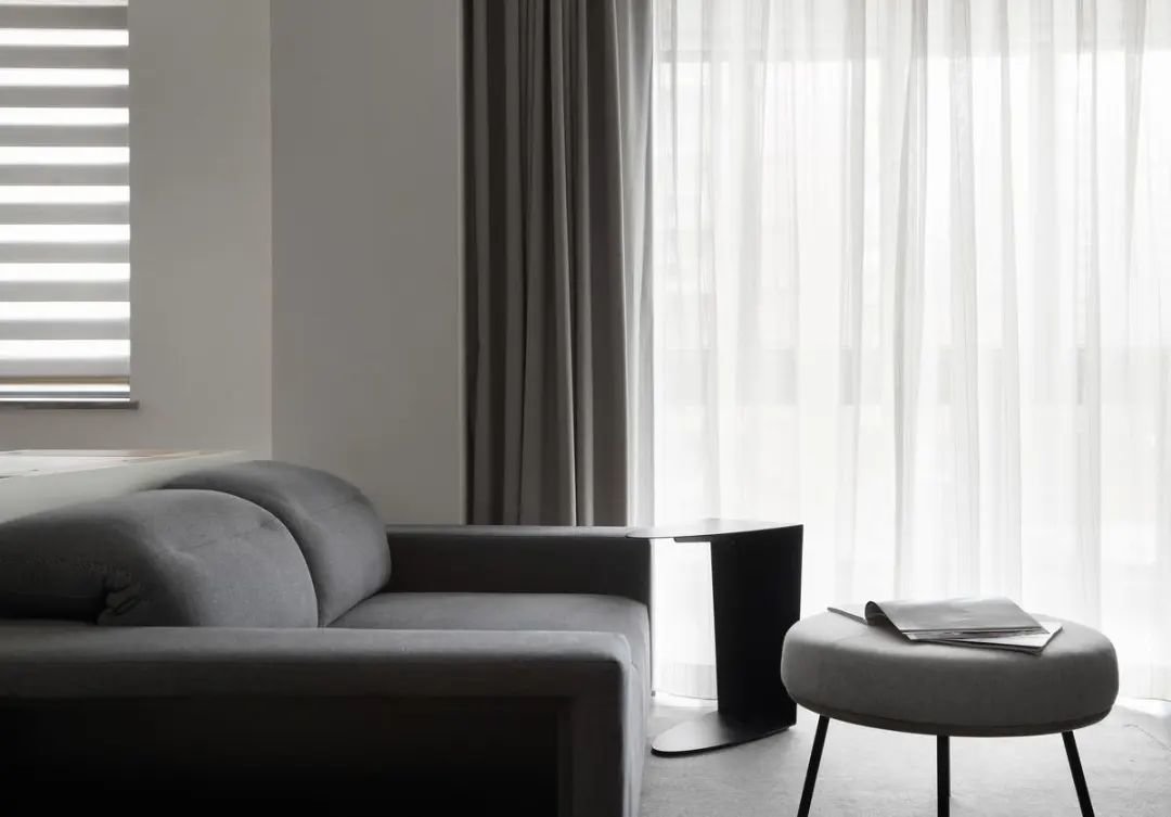 ▲简简单单的布艺沙发、布艺凳子、还有极简的边几,搭配灰色窗帘+纱帘的组合,让小客厅也充满实用温馨自然气息感。