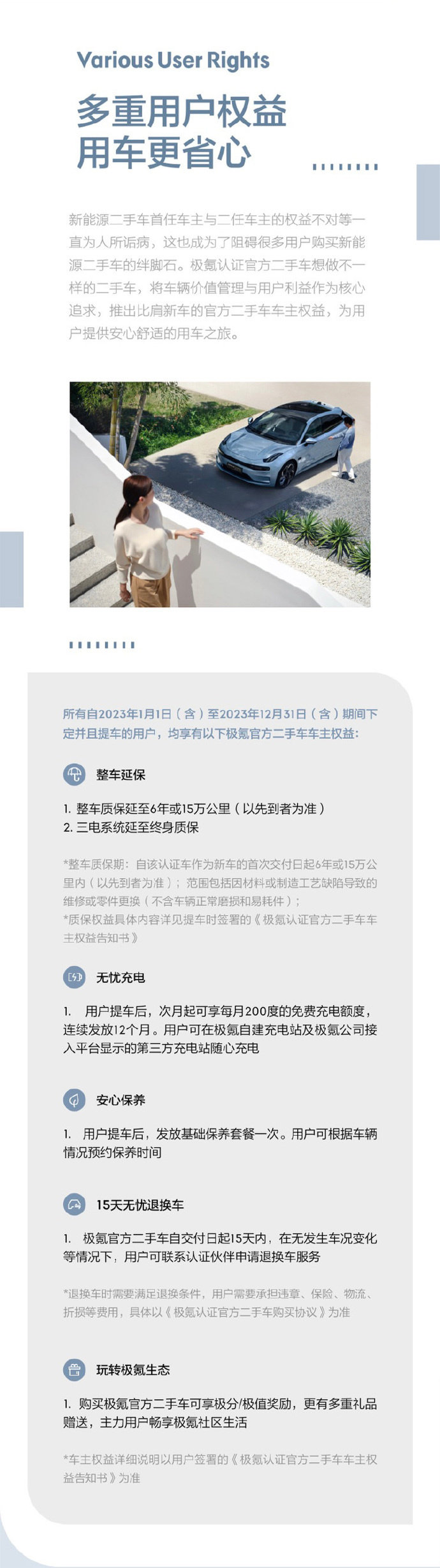 此外,2023 年期间下定并提车的极氪二手车车主,享有整车延保、无忧充电、15 天退换车等服务。