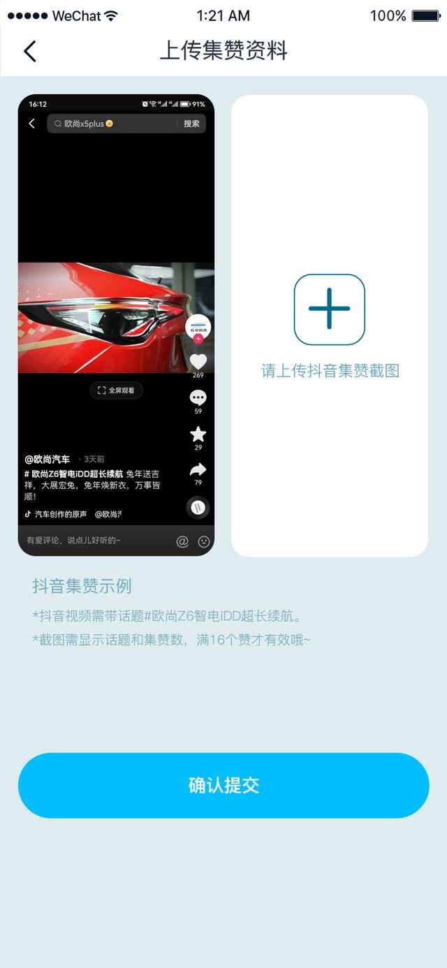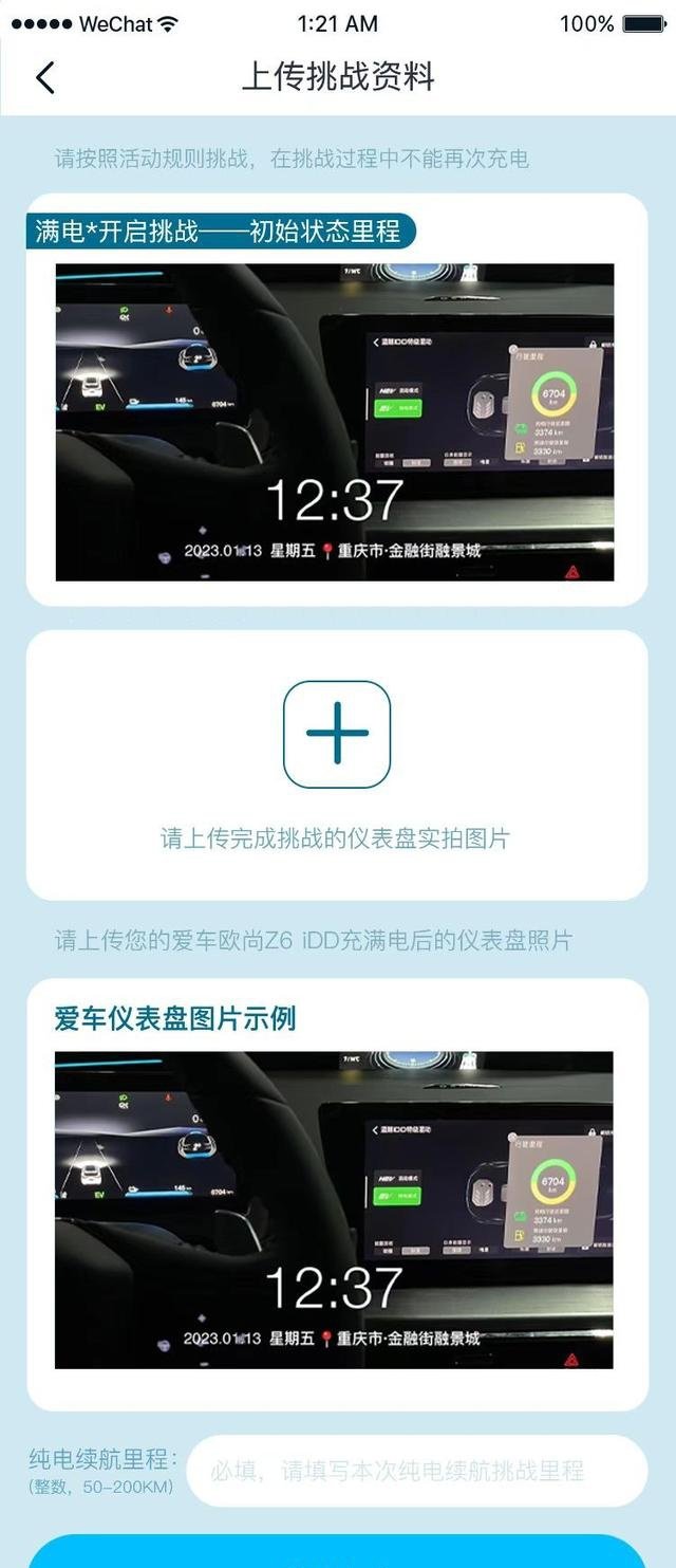 挑战流程也非常简单:开始比赛前,用户拍摄含【拍摄日期、里程数据】的仪表盘照片后,即可自行开始比赛;完成比赛后,再次拍摄含【拍摄日期、里程数据】的仪表盘照片;将两张仪表盘+中控照片上传至欧尚Style指定页面,并手动填写行驶里程数,即可完成比赛。