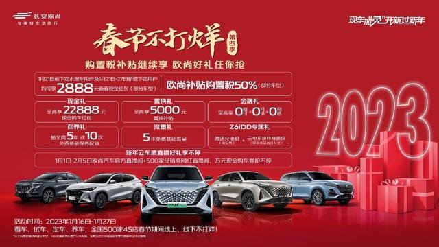 这次“纯电续航大挑战,春节出行0油耗”活动是继1月16日第四季“春节不打烊”活动启动之后,欧尚汽车发布的又一项宠粉福利。在国补退坡的大背景下,欧尚汽车第四季“春节不打烊”继续对部分车型提供购置税补贴50%的优惠政策。同时,还推出“现金礼”至高享22888元现金购车红包、“置换礼”至高享5000元置换补贴、“金融礼”至高享0首付或0月供或0利息、“保养礼”抽至高5年或10次免费基础保养权益、“流量礼”5年免费基础流量,以及“Z6 iDD专属礼”赠送充电桩(含安装)+三电系统终身质保(限非营运首任车主)等六大好礼回馈消费者。