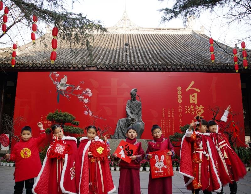 “锦水春风公占却,草堂人日我归来”,杜甫的不朽诗作为我们留下了巨大的精神财富,自清代,人日祭杜就已成为成都的一大风俗。文人墨客于每年人日云集草堂,挥毫吟诗,凭吊诗圣。