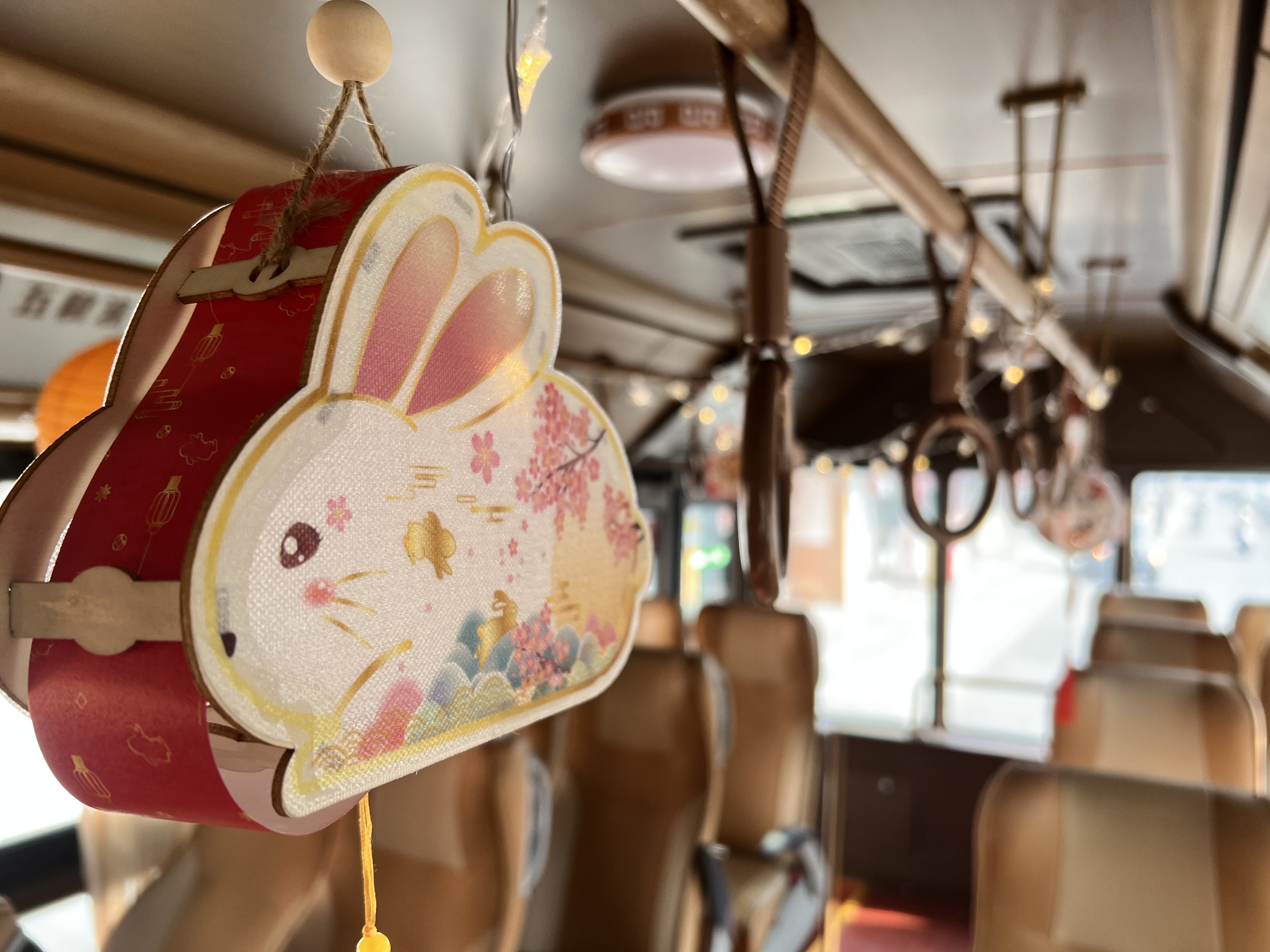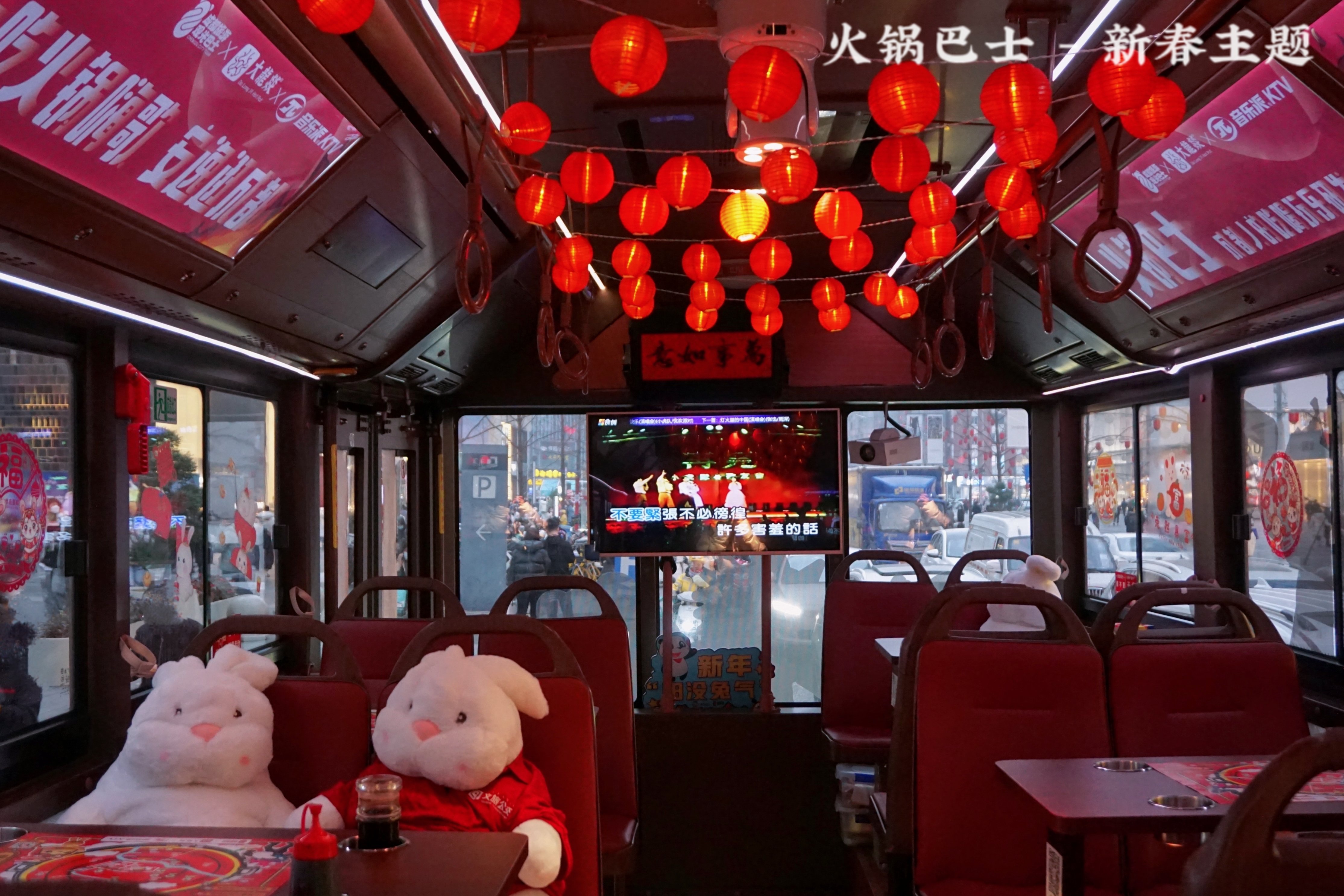 2022年爆火的火锅巴士和双层旅游观光巴士已穿上兔年“新衣”,红灯笼、兔子灯笼、新春对联、萌兔玩偶……在一系列喜庆新春的氛围点缀下,一路带领着游客看城市新年街景、听行车助理讲解城市文化,沉浸式体验成都的幸福年。