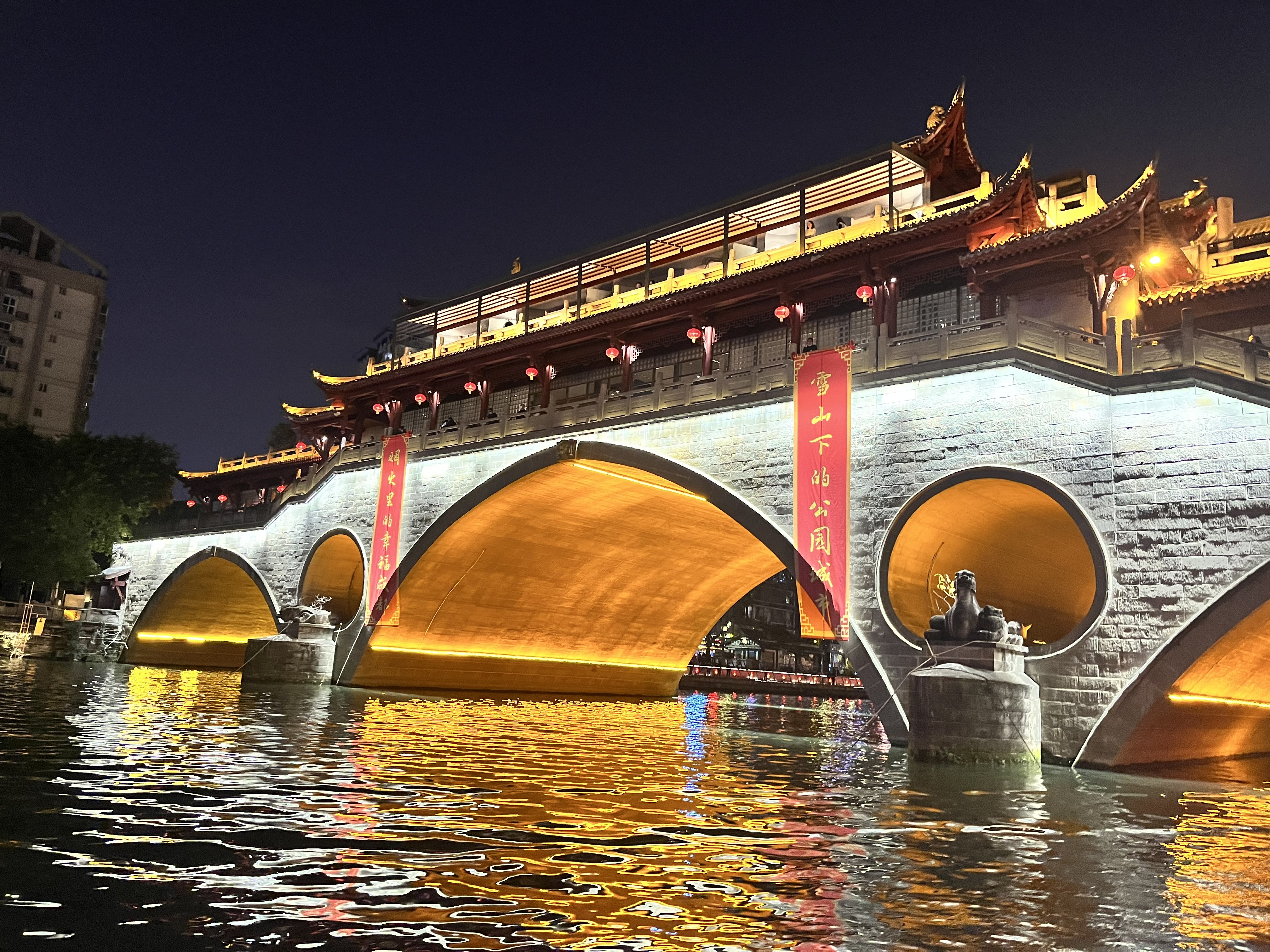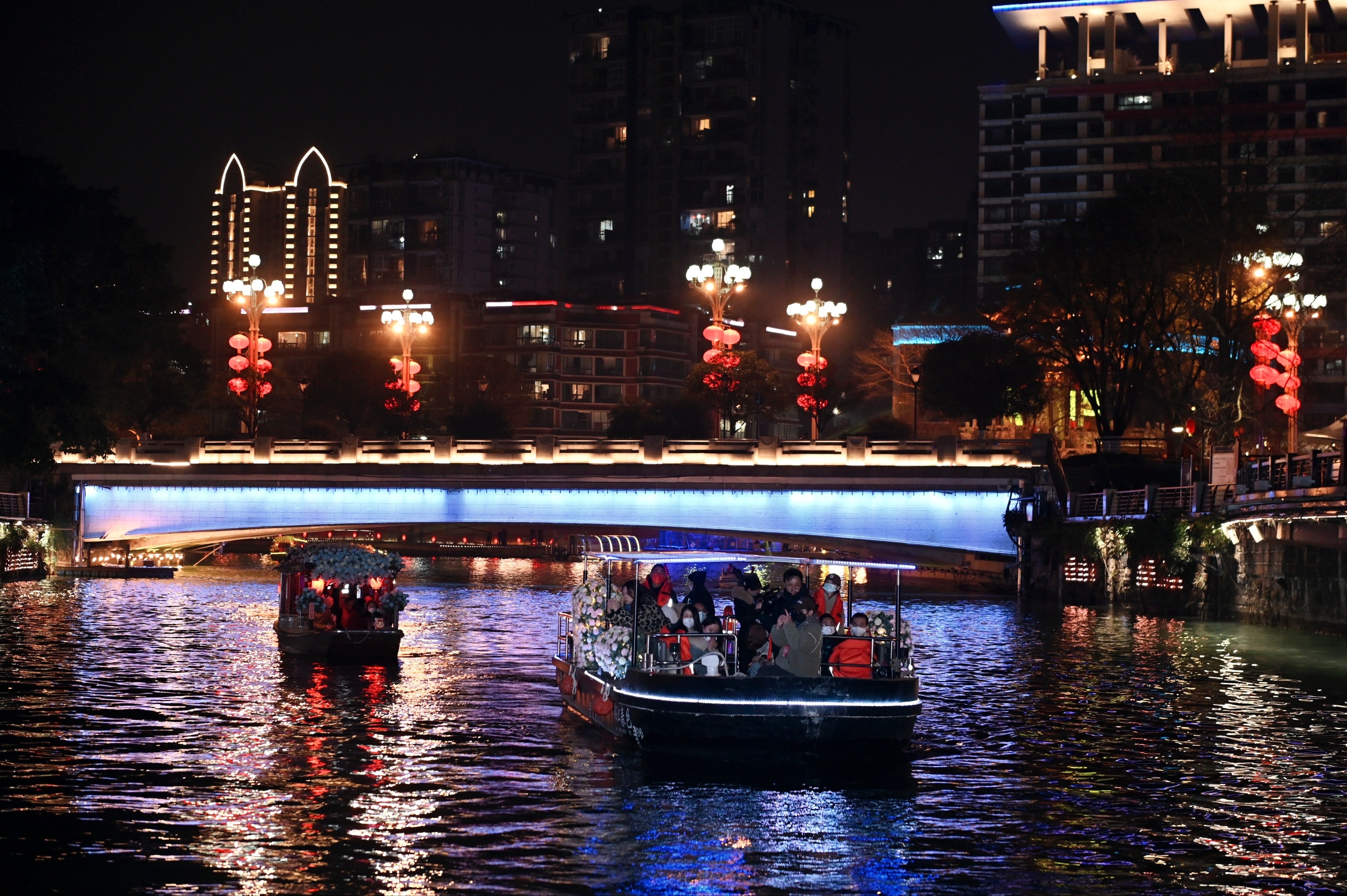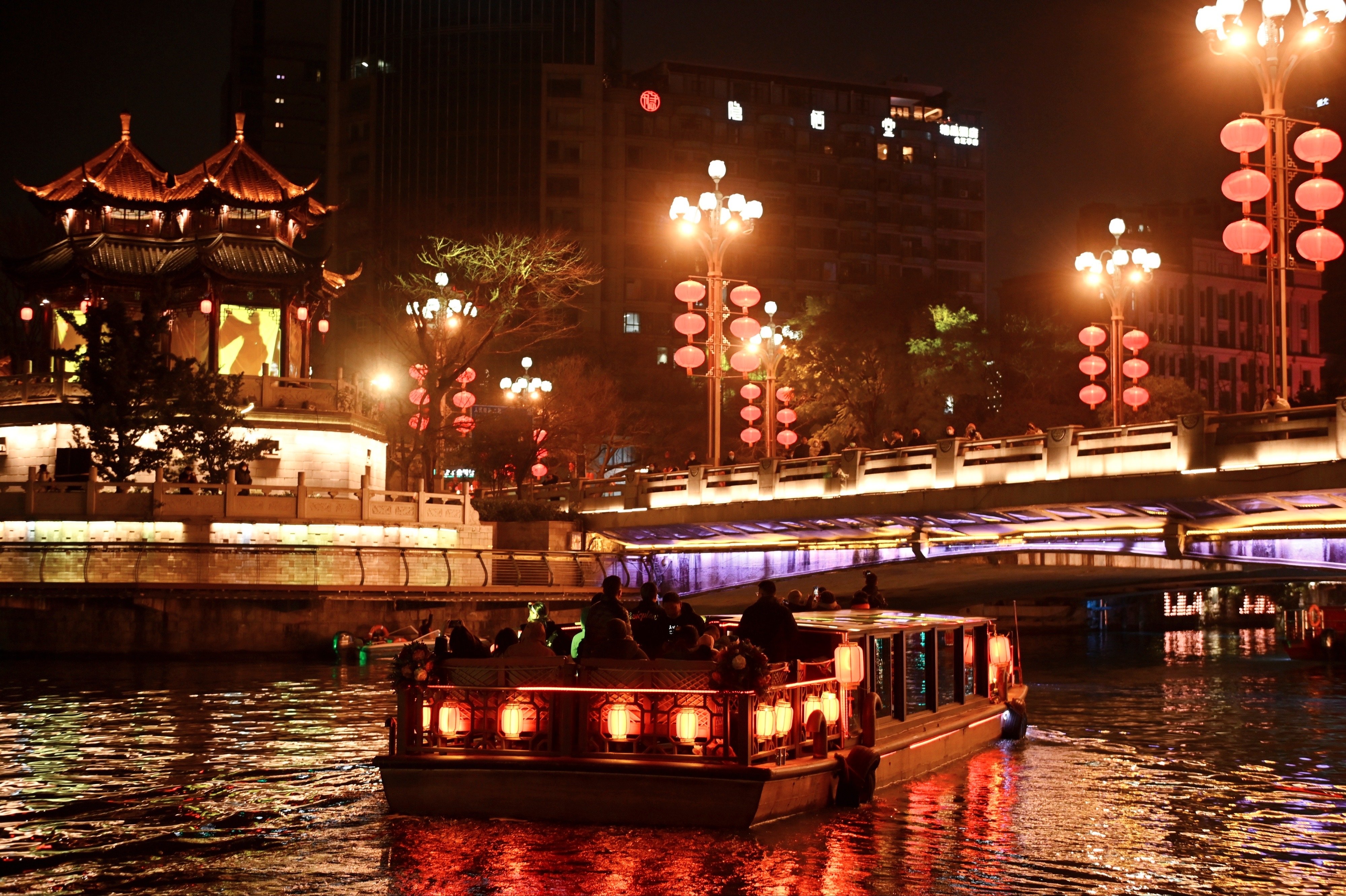 古声古乐悠扬、泛舟锦江之上、沉浸绚丽灯光……2023年春节,在成都的游客们可以感受以锦江为主轴的大型沉浸式剧游“锦江之上”,从中了解天府文化、体验成都魅力;也可以在舟上偶遇“杜甫”“李白”同游锦江,近距离观赏两岸及游船上的精彩演出。