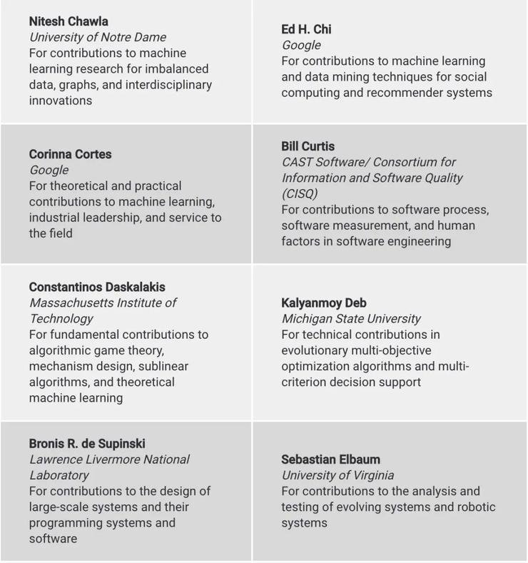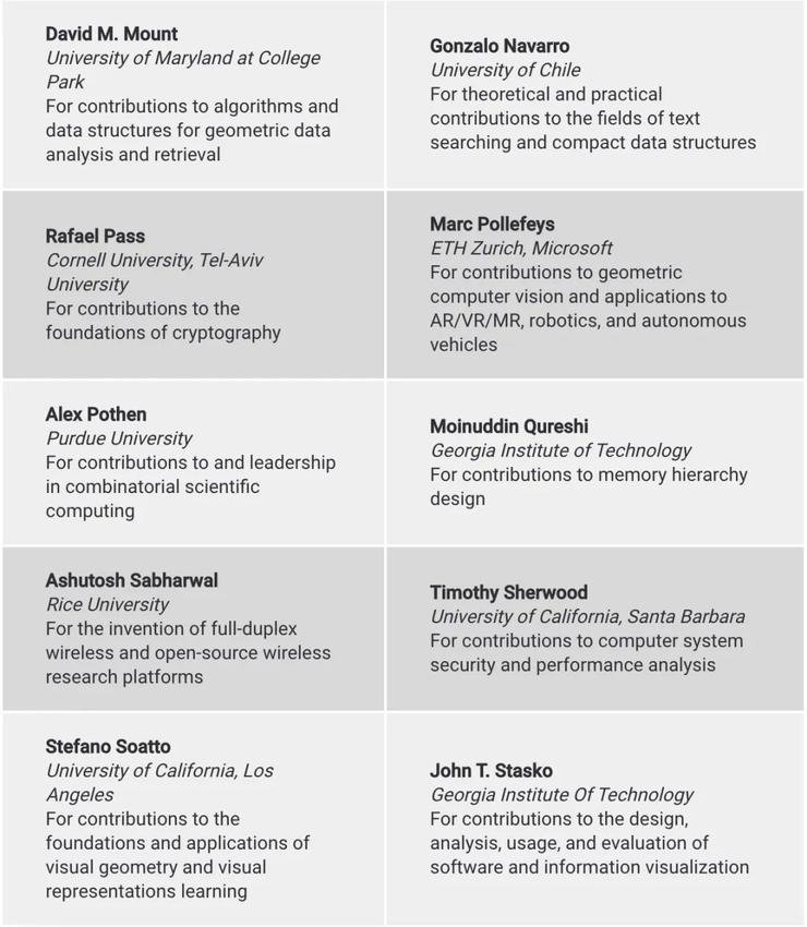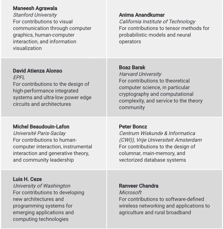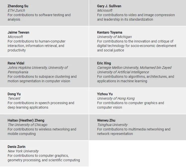 而 ACM Fellow 则设立于 1993 年,用于表彰在计算和信息技术领域从业五年以上,并做出了「突出贡献」(Exceptional Contributions) 的科学家,是 ACM 所有会员中最顶尖的那 1% 位成员。