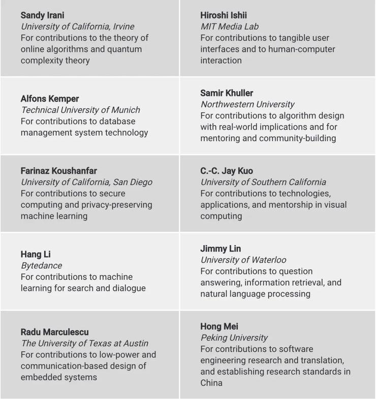 每年,我们都希望有一批最杰出的人成为 ACM Fellow,ACM Fellow 是我们整体认可的基石,在强调ACM Fellow的成就时,我们希望给予应有的赞誉,同时也向公众传播计算机专业人员所从事的特殊领域。”