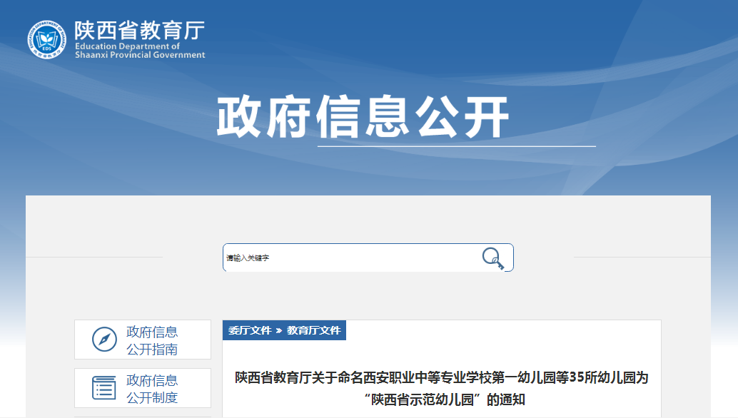 据陕西省教育厅官网获悉,1月18日,省教育厅发出通知,命名西安职业中等专业学校第一幼儿园等35所幼儿园为“陕西省示范幼儿园”。