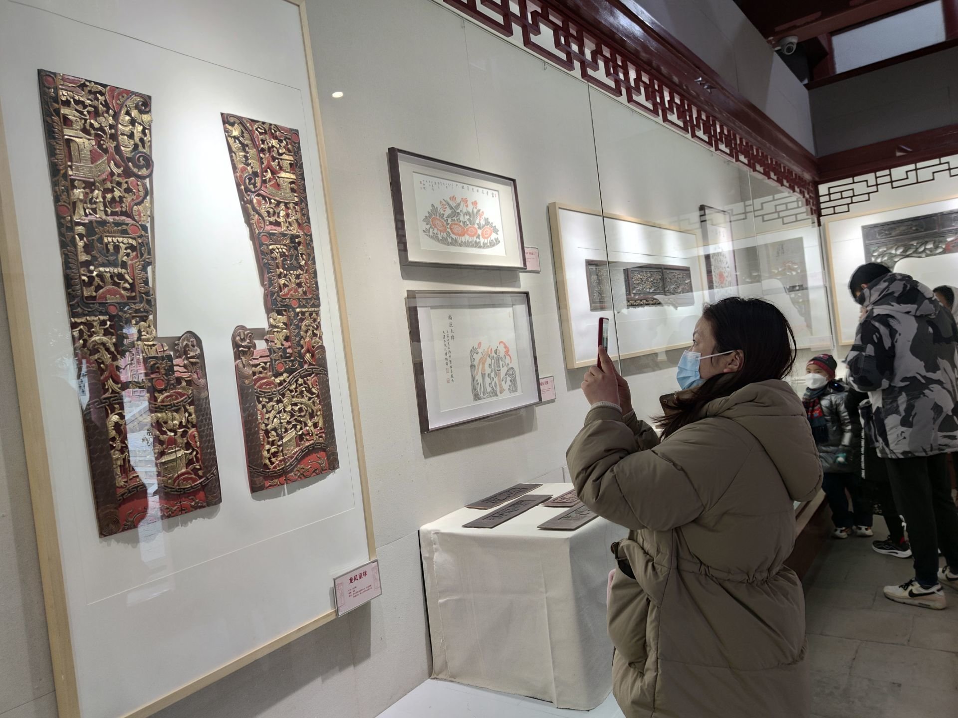 游客在观看《祥纹纳瑞中国古典家具民俗文化展》。