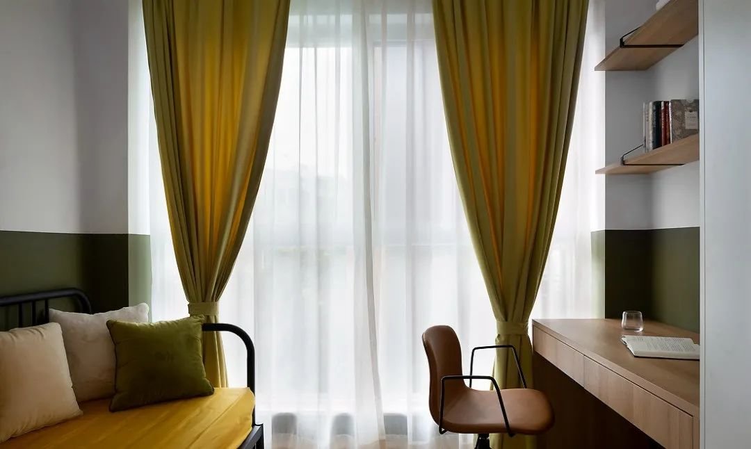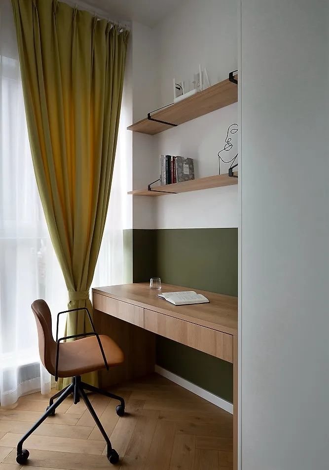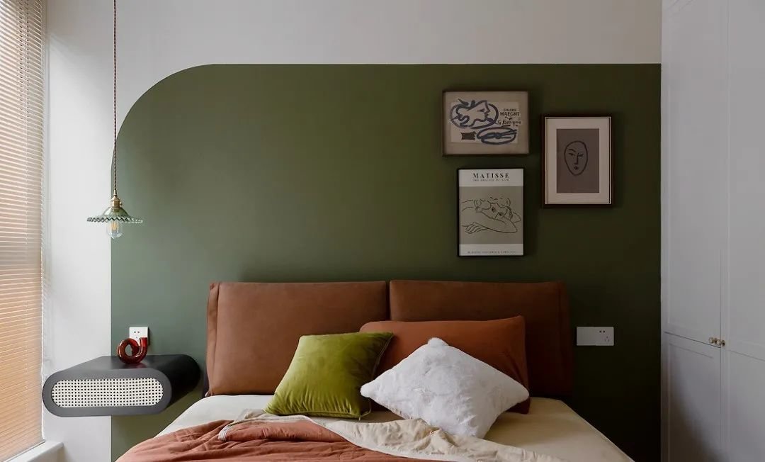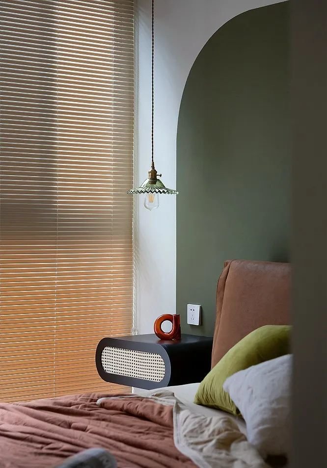 次卧分色墙使用的雪松绿,与百叶窗的均衡搭配,打造出优雅的空间氛围。