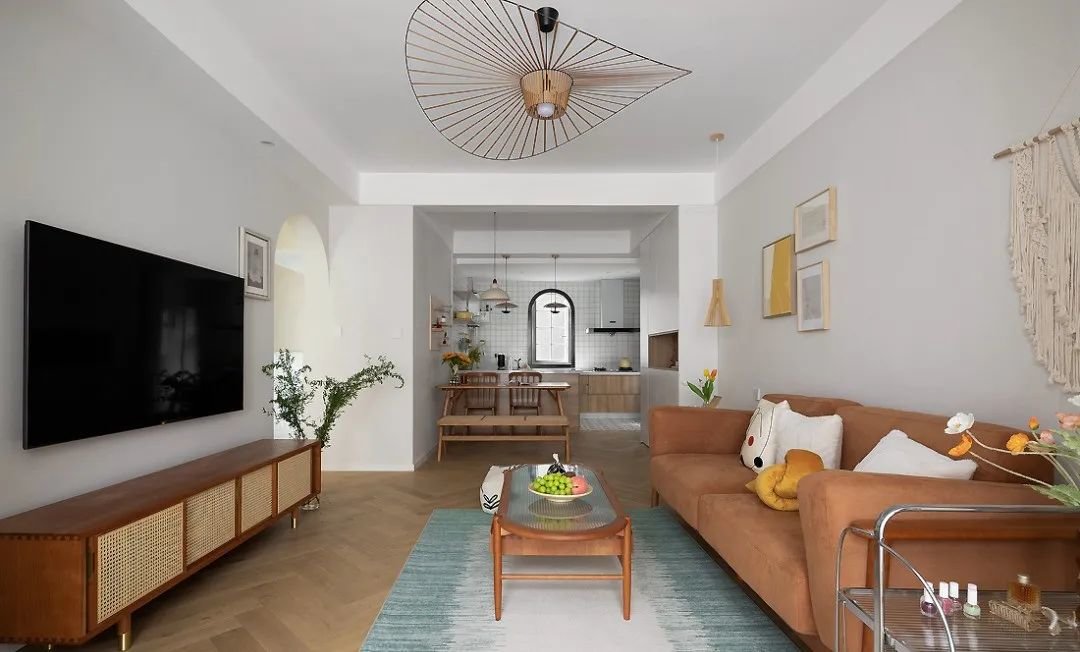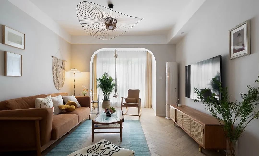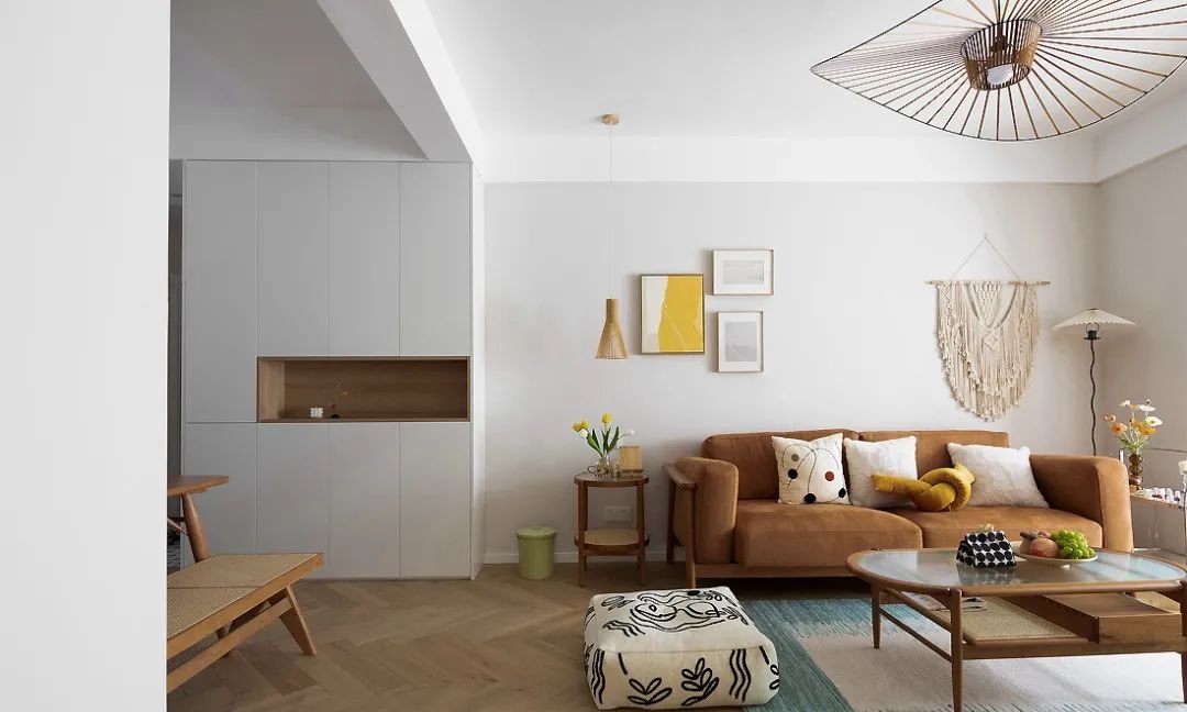 客厅整体以自然感的奶茶色系墙面为基调,配以色度不同的原木材质作为点缀,反馈出屋主随意且自由的生活方式。