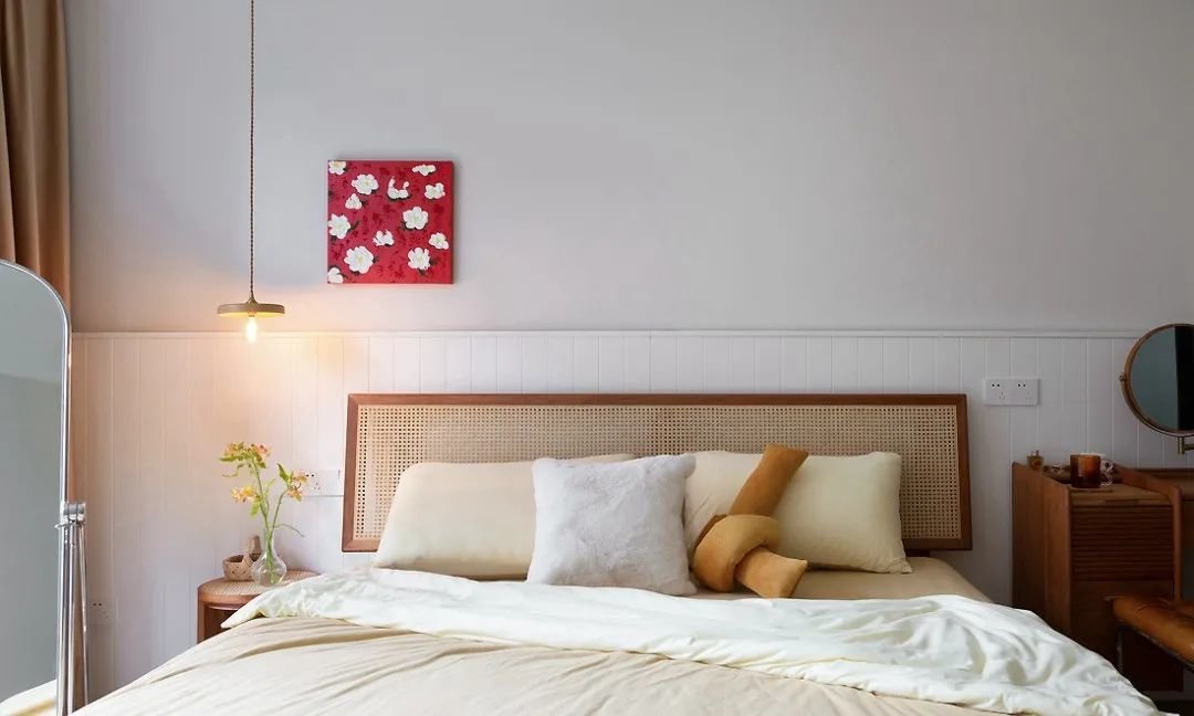 主卧床头背景选择了木头材质,营造出的氛围能够带来安全感。