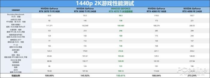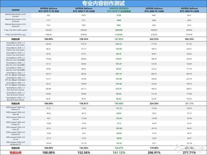 可以看到以RTX3070Ti的各项细分成绩作为对比的基准点,可以看到3DMark部分的测试,RTX3090Ti的理论性能部分略领先映众 RTX4070Ti 冰龙超级版,并且其比例也仅为1.78%,其实整体性能的差距其实非常的接近。