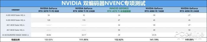 同时,ADA架构RTX40显卡支持双编码器NVENC,并支持最新版本的AV1视频格式的编码解码,而上代RTX30则不支持AV1测试,所以RTX40系列获得了独一无二的功能优势,而RTX40系列不同型号之间的对比差异呈现阶级式的性能上升表现,映众 RTX4070Ti 冰龙超级版在AV1的4K30和8K30的Faster Hq/s成绩也只是比RTX4080和RTX4090相差1到6秒的差距,除非需解码数据量极大的内容,如果是主流常规级别的内容解码,其性能表现也能为用户带来高效的执行支持。