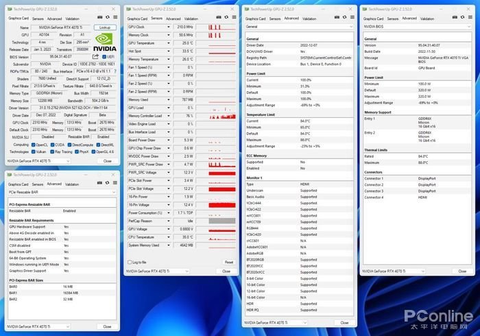 测试前,通过GPU-Z对显卡的运行状态以规格参数进行再次的检查,避免因为运行状态及参数不正确而导致测试成绩不正确。同时也能通过GPU-Z所呈现的数据来看看映众 RTX4070Ti 冰龙超级版更为细分的规格参数以及当前平台运行状态在功耗、各部分电力供给、温控、风扇状态等系列数据及状态。