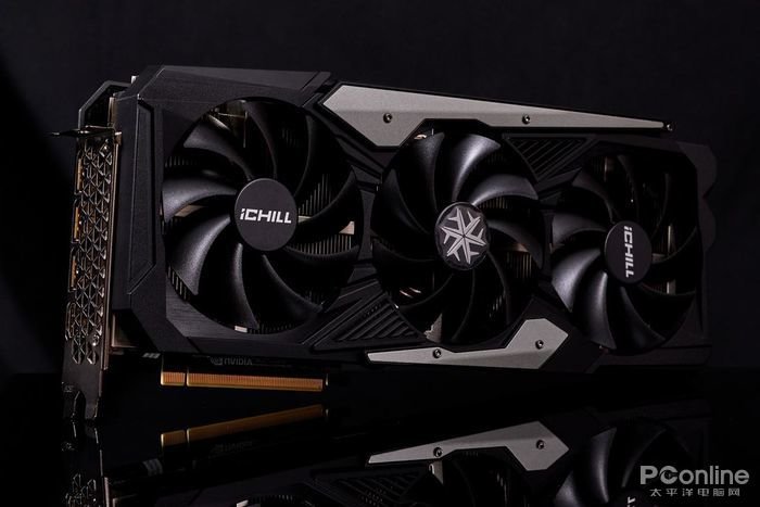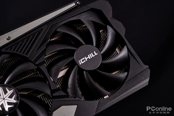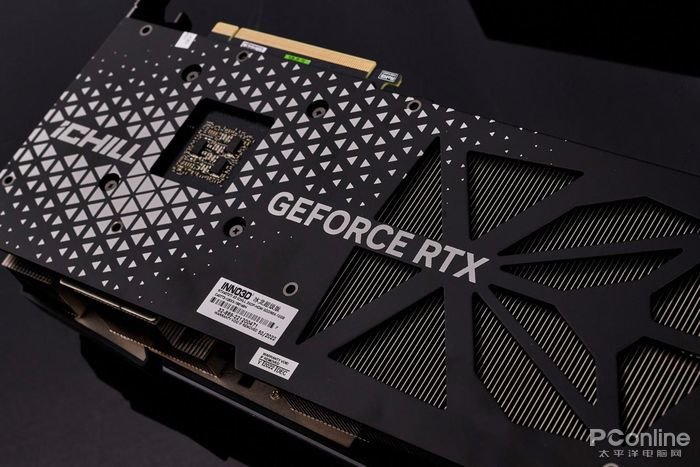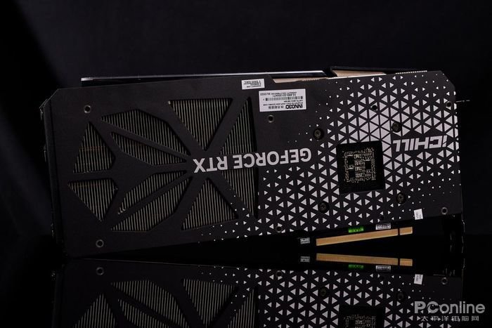 而显卡背面则安装有金属强化背板设计,在全黑哑光处理的背板上在靠近显卡GPU核心区域印有多个白色三角形图案组成的类雪花图案,并将“iCHILL”和“GEFORCE RTX”字样融入于图案内。