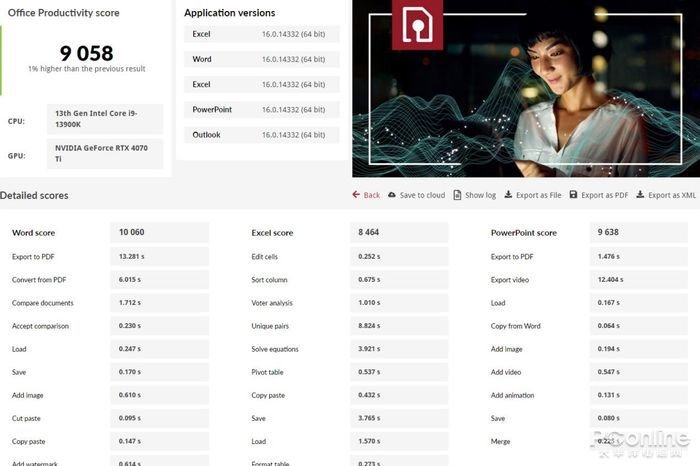 办公生产力测试中,映众 RTX4070Ti 冰龙超级版显卡的测试成绩总分为9058,其中Word测试成绩为10060;Excel测试成绩为8464;PowerPoint测试成绩为9638。