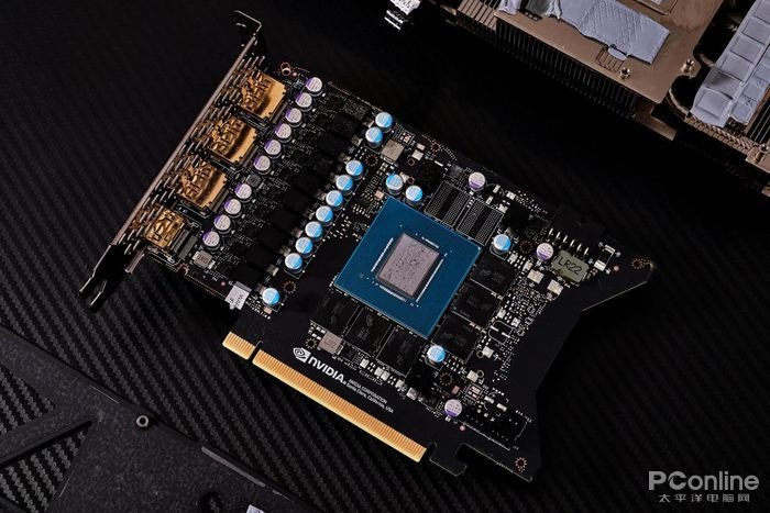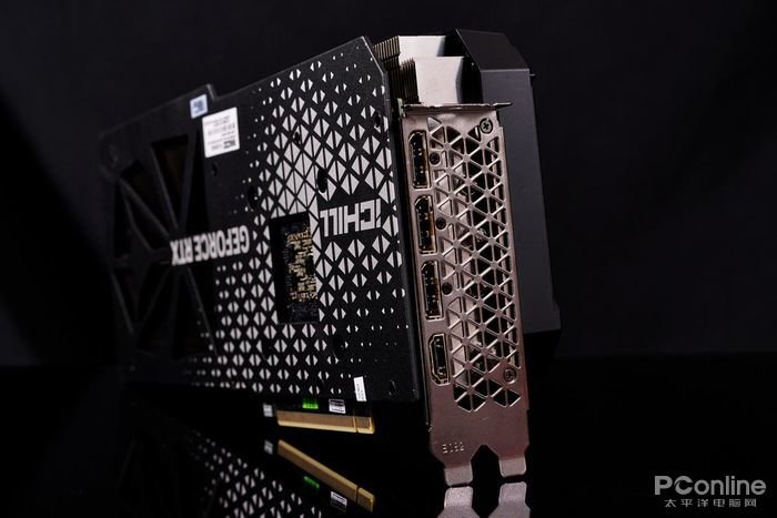 显卡输出接口面板采用双PCI插槽设计,3个DP1.4a+1个HDMI2.1全数字视频输出接口组合以竖直的方式排布在紧贴PCB基板的面板左侧,可为用户实现超高分辨率以及构建多屏幕输出带来输出端口的应用支持。而接口右侧面板则是采用了网孔式镂空设计,为显卡散热系统提供抽排风以及热量交互的支持。