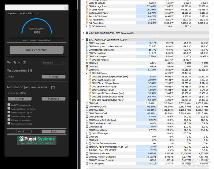 PugetBench for After Effects测试中,映众 RTX4070Ti 冰龙超级版显卡的测试成绩为1588。
