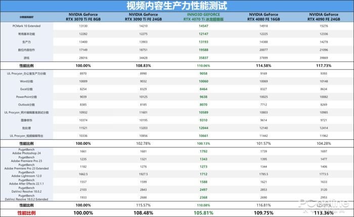 在应用场景模拟部分,可以看到映众 RTX4070Ti 冰龙超级版显卡所呈现的成绩与其他几款显卡进行对比来看,整体表现还是非常出色的,特别是对比RTX3090Ti和RTX4080两款显卡之间的性能比例差异其实并不会有很大的差异,特别是更趋于性能表现的图片和视频处理测试上,分数差异非常接近,也只是RTX3090Ti以微弱的优势处于成绩领先的位置,而在实际应用所表现出来的结果以及效率几乎处于同一水平线上。