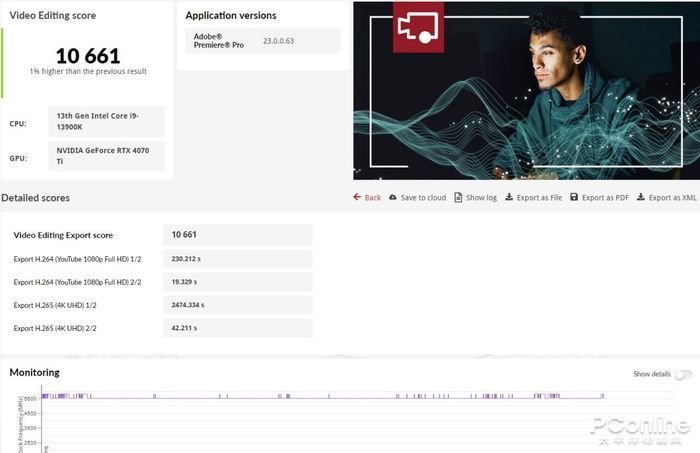 视频处理测试中,映众 RTX4070Ti 冰龙超级版显卡的测试成绩总分为10661,其中视频编辑导出成绩为10661。