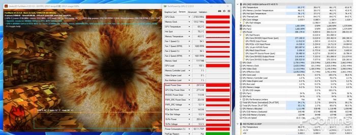 通过FurMark软件对显卡进行满载测试,并进行十分钟的拷机测试,以获得显卡的温度数据、运行噪音以及功耗等系列数据。利用Furmark测试软件,我们对显卡进行烤机测试,同步打开最新版本的GPU-Z,可查看到显卡的温度、显存温度、风扇转速、功耗,以及供电功耗等信息。