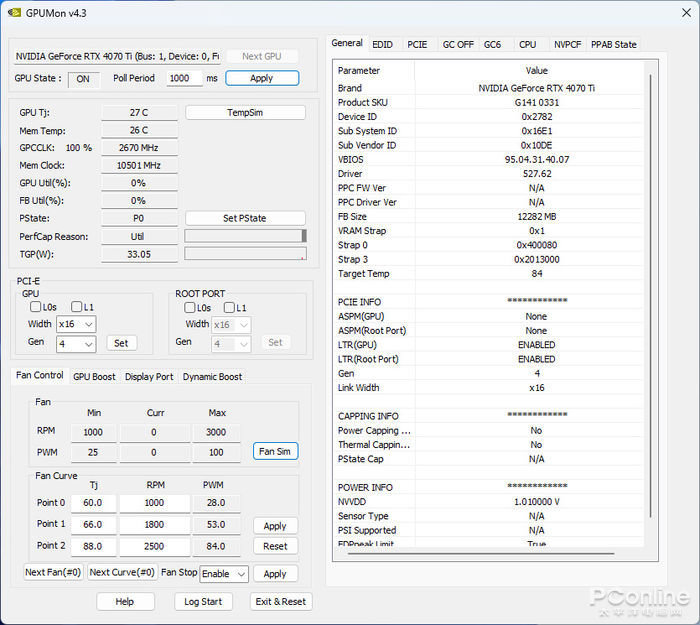 此外,通过GPU Mon监控软件对显卡的BIOS规格参数有更细分化的表现,如显卡BIOS中除了能看到和GPU-Z相类似的规格参数之外,还能看到显卡对散热系统风扇的控制策略,如显卡60度时,风扇的转速为1000PRM,当提升至66度时,转速会提升到1800PRM,到88度时转速更是提升到2500PRM。
