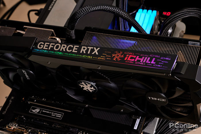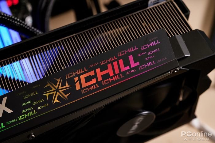 当显卡尚未通电运行时,仅能看到非透光设计的丝印黑底白字“GEFORCE RTX”字样,其他灯箱区域呈现黑色的面板。但当显卡通电运行后,灯箱内彩灯开启则能呈现出带有“iCHILL”字样的各式冰龙系列LOGO。