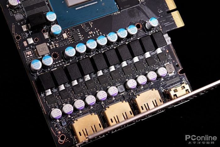 显卡供电电路主要布局于靠近显卡PCB基板前端区域,采用的是13相供电设计,每相供电均由日系电容铁素体电感和Dr.MOS构建而成,保证了显卡各功能电路在运行时的电力稳定支持。