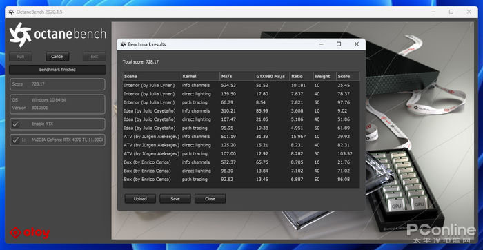 Octanebench 渲染测试,映众 RTX4070Ti 冰龙超级版显卡的测试成绩为728.17。