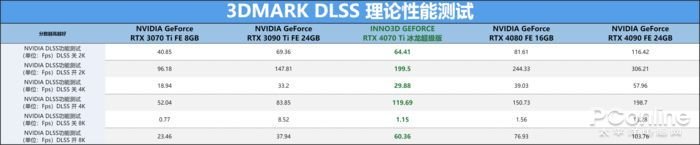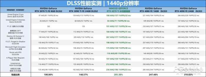 而关于显卡的DLSS性测试部分,当开启DLSS后,映众 RTX4070Ti 冰龙超级版更为出色的DLSS性能对比RTX3090Ti在测试中能提供更优异的帧数表现,而且得由于搭载了第四代Tensor Core和光流加速器提供的支持,对比上一代旗舰在帧数上轻松拉开一倍甚至更高的帧数差距。