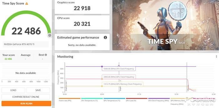 Time Spy测试中,映众 RTX4070Ti 冰龙超级版显卡的测试成绩总分为22486,其中显卡成绩为22918.