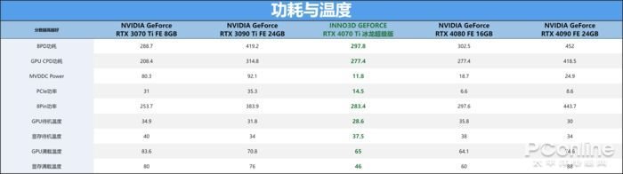 映众 RTX4070Ti 冰龙超级版显卡在满载测试过程中,核心温度在65.2℃,显存温度也在46℃,在温控表现上在第八代冰龙散热系统的加持下有非常出色的表现。在功耗上,显卡核心的功耗为298W,GPU芯片功耗为277.4W,并且光16Pin的12VHPWR接口就支持了283.4W的电力供给,可见新接口给予显卡的供电支持已经非常重要,也降低了主板PCIe接口的供电压力。