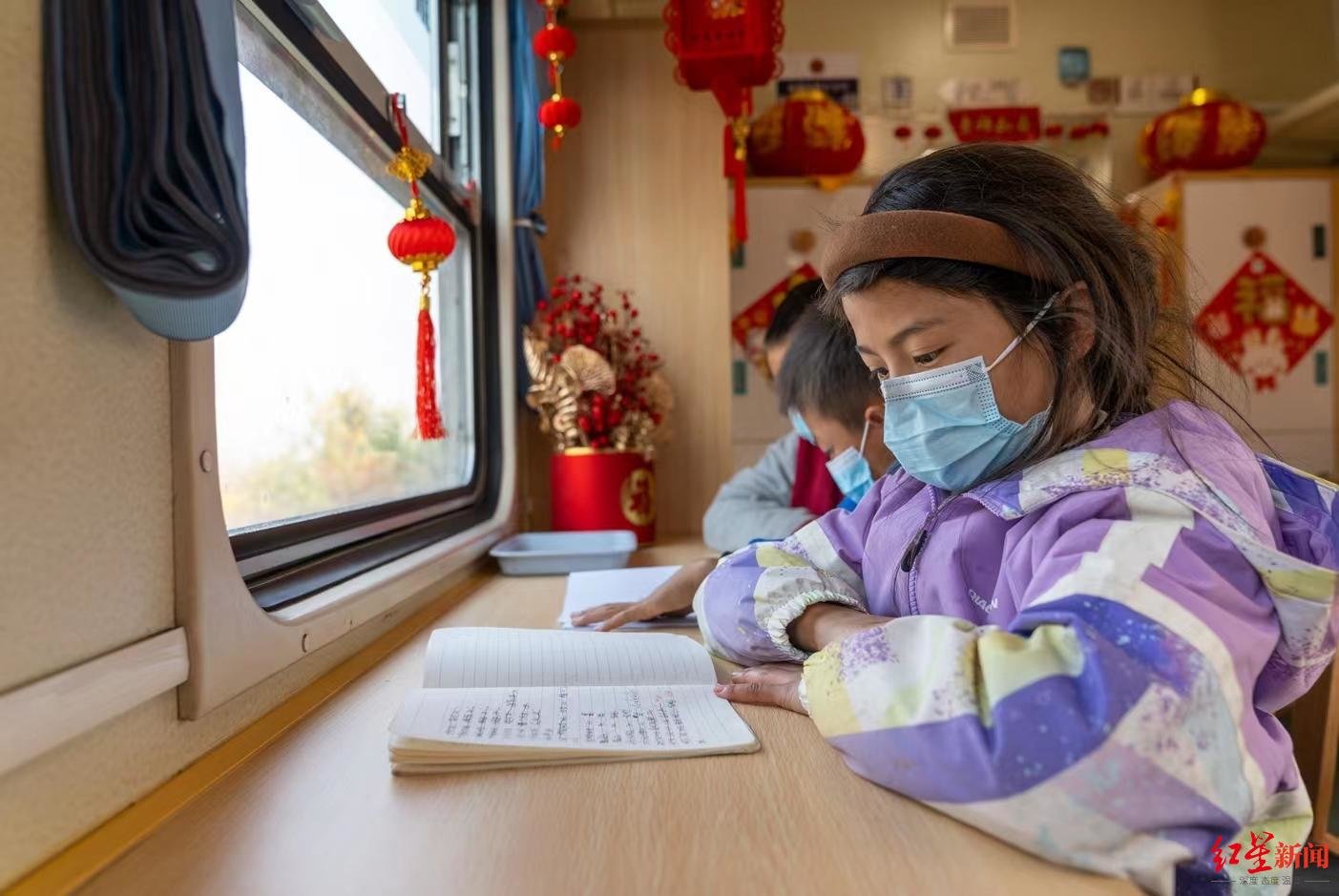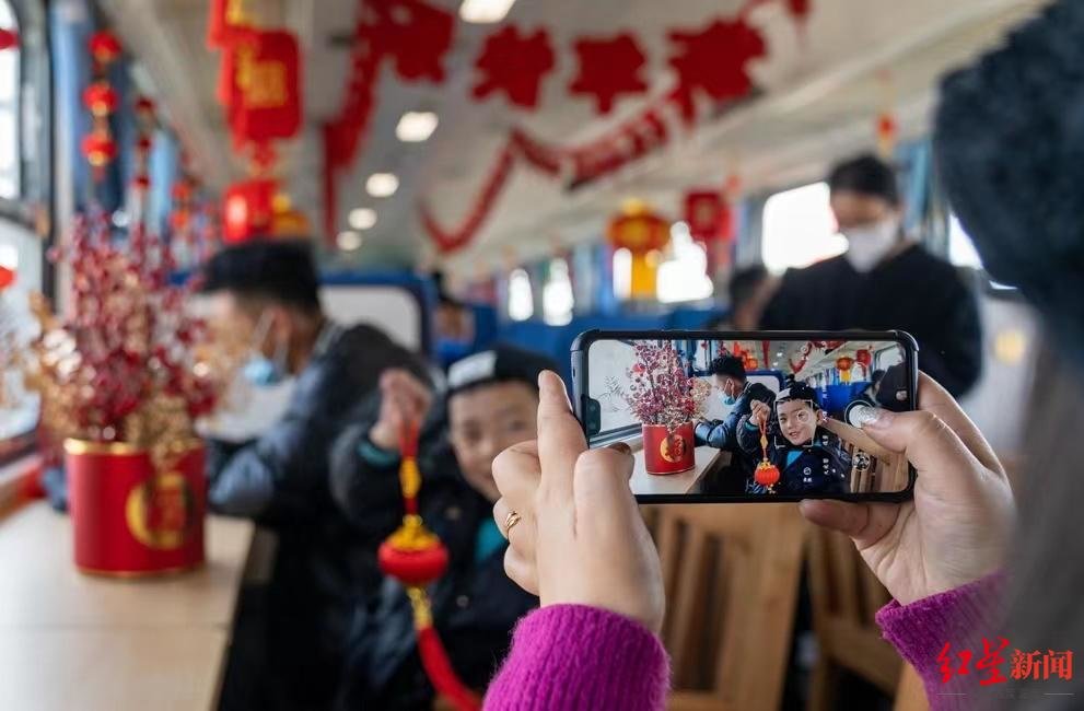 临近年关,“彝乡情”慢火车车厢年味儿十足。车窗上红艳艳的窗花,两侧高挂的红灯笼,就连车厢的座位套上也装饰上了喜庆的蝴蝶结。
