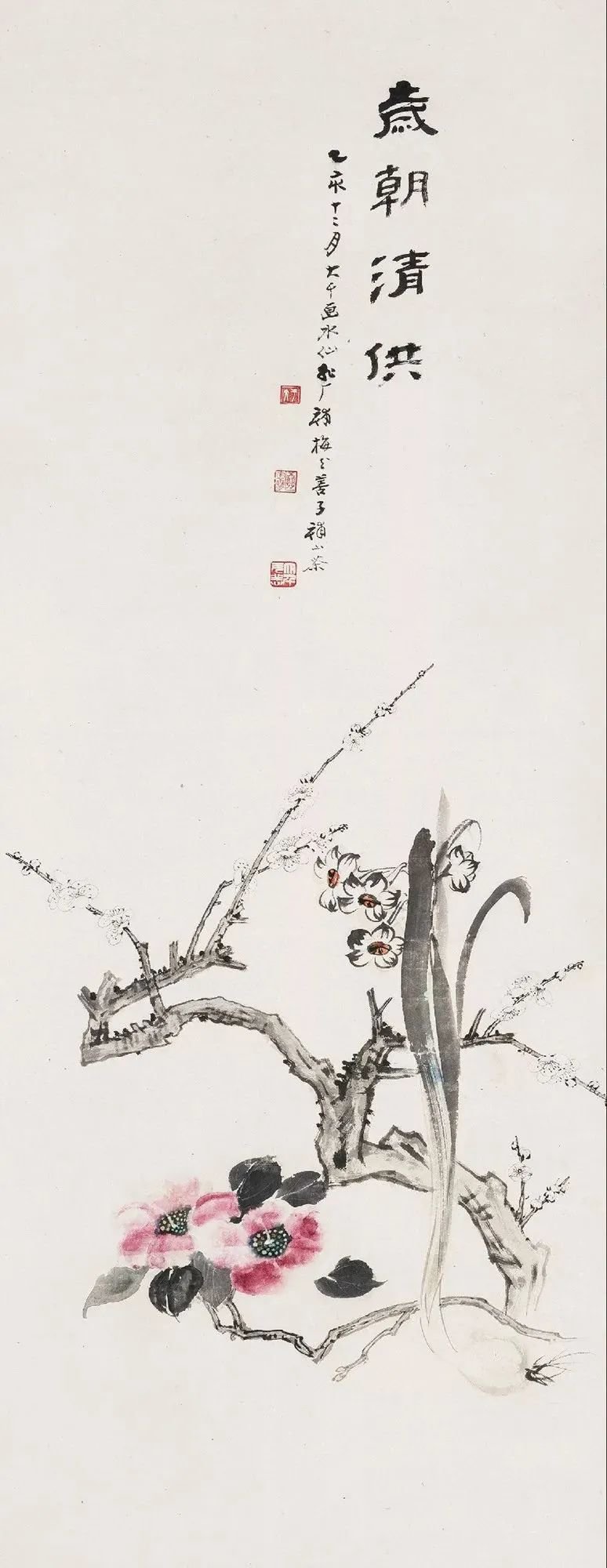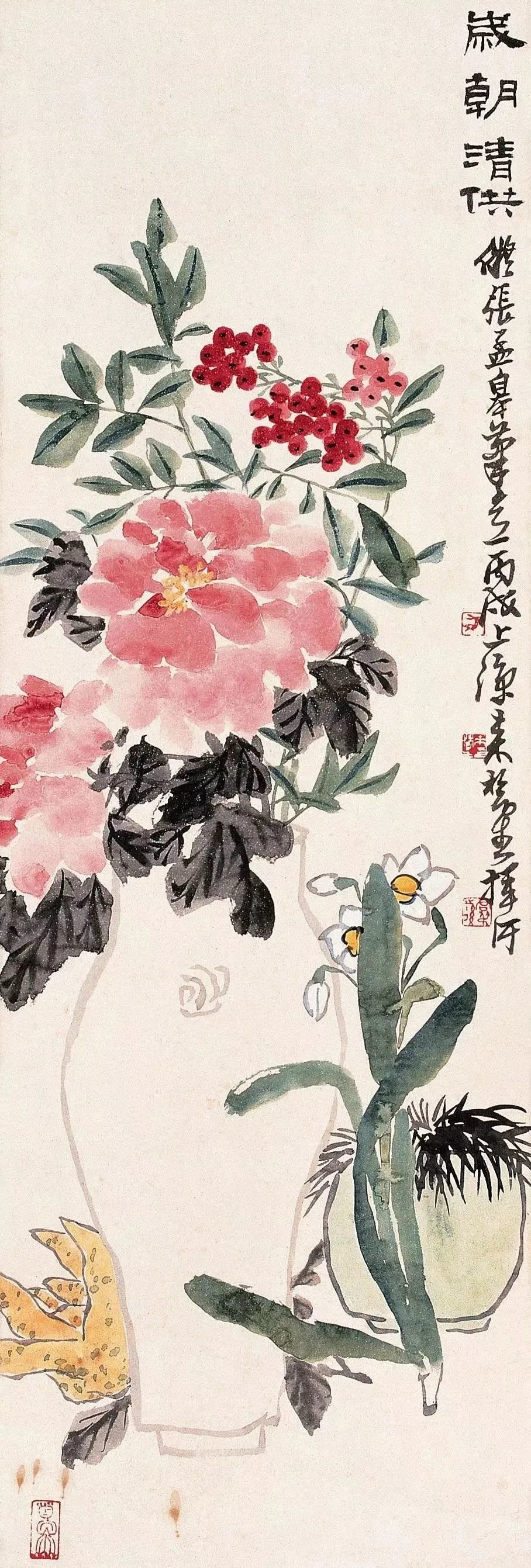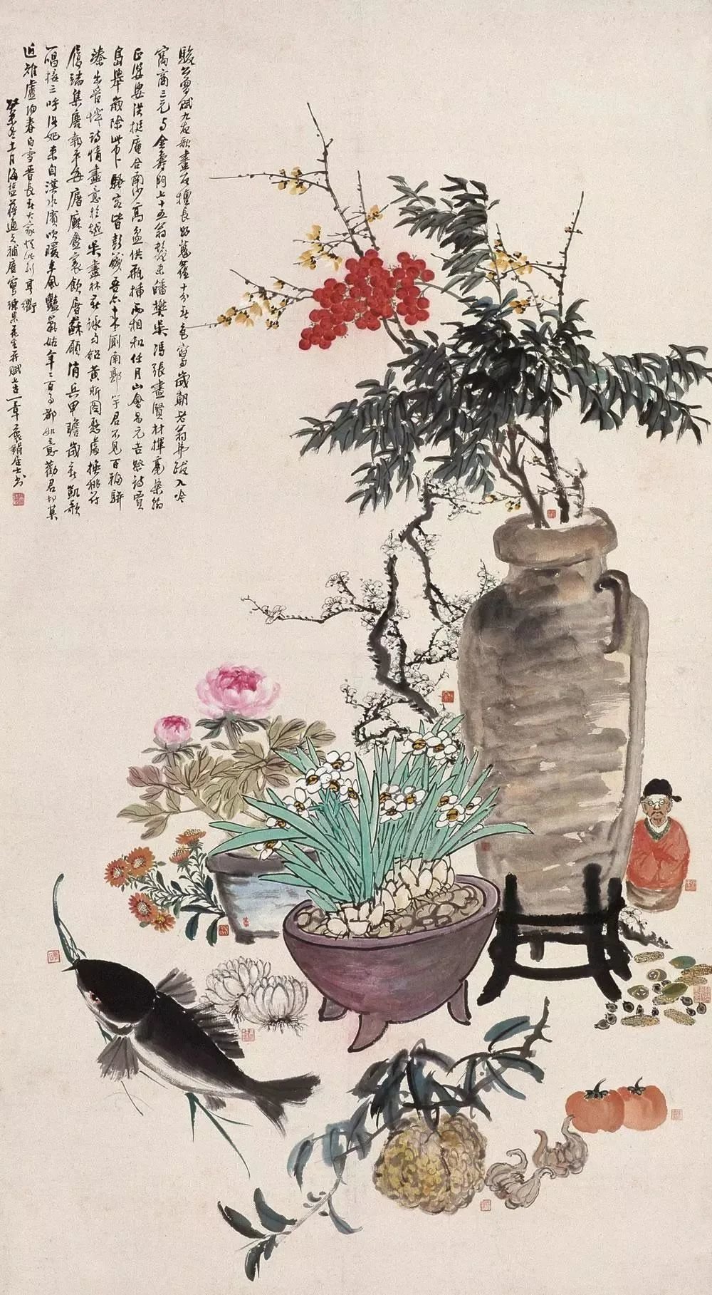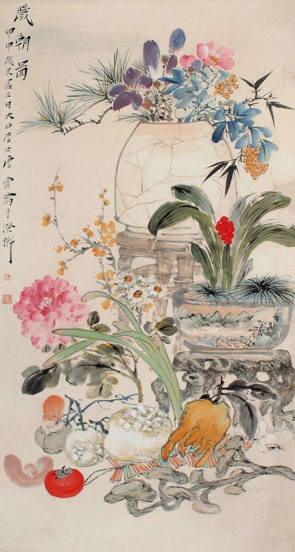 清末民初的绘画大师的巨幅《岁朝清供图》中描绘的清供花果多达七种,皆为新春时盛开的应时花卉和果实,有水仙、天竹子、牡丹、佛手、菖蒲、荔枝与释迦,其寓意“事事如意,尽随人缘”,充满了喜庆吉祥的气氛。