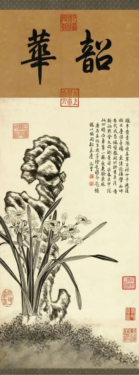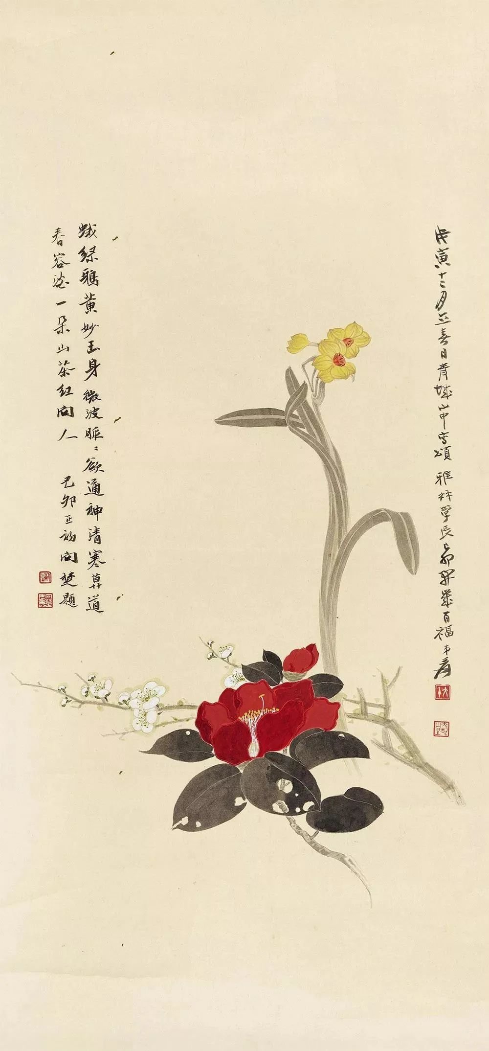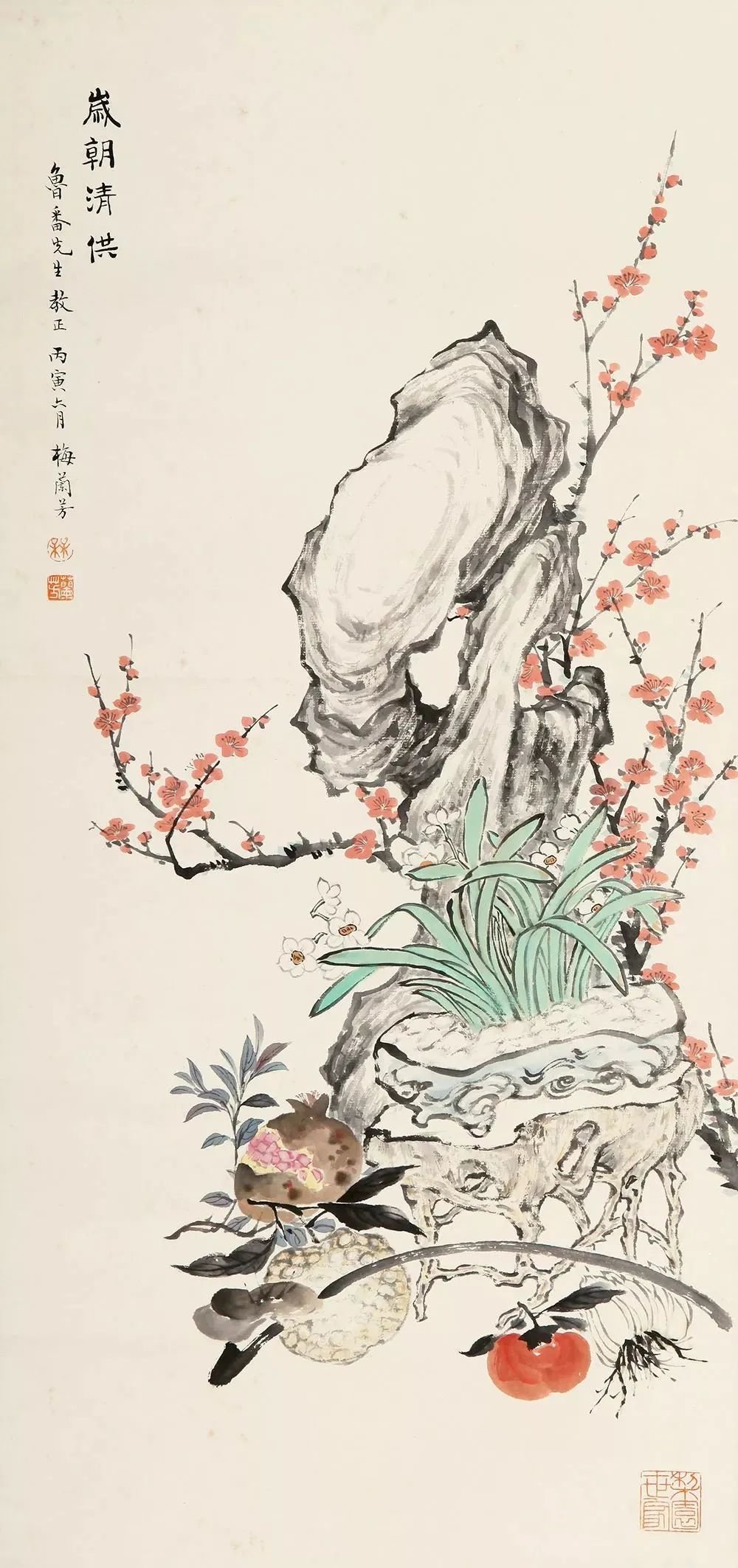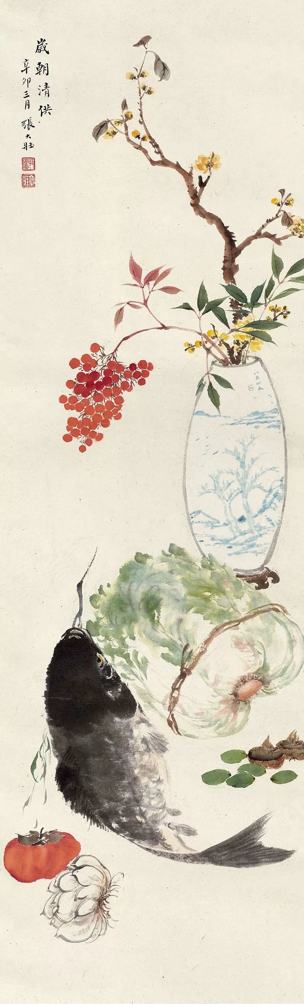 清末民初的绘画大师的巨幅《岁朝清供图》中描绘的清供花果多达七种,皆为新春时盛开的应时花卉和果实,有水仙、天竹子、牡丹、佛手、菖蒲、荔枝与释迦,其寓意“事事如意,尽随人缘”,充满了喜庆吉祥的气氛。