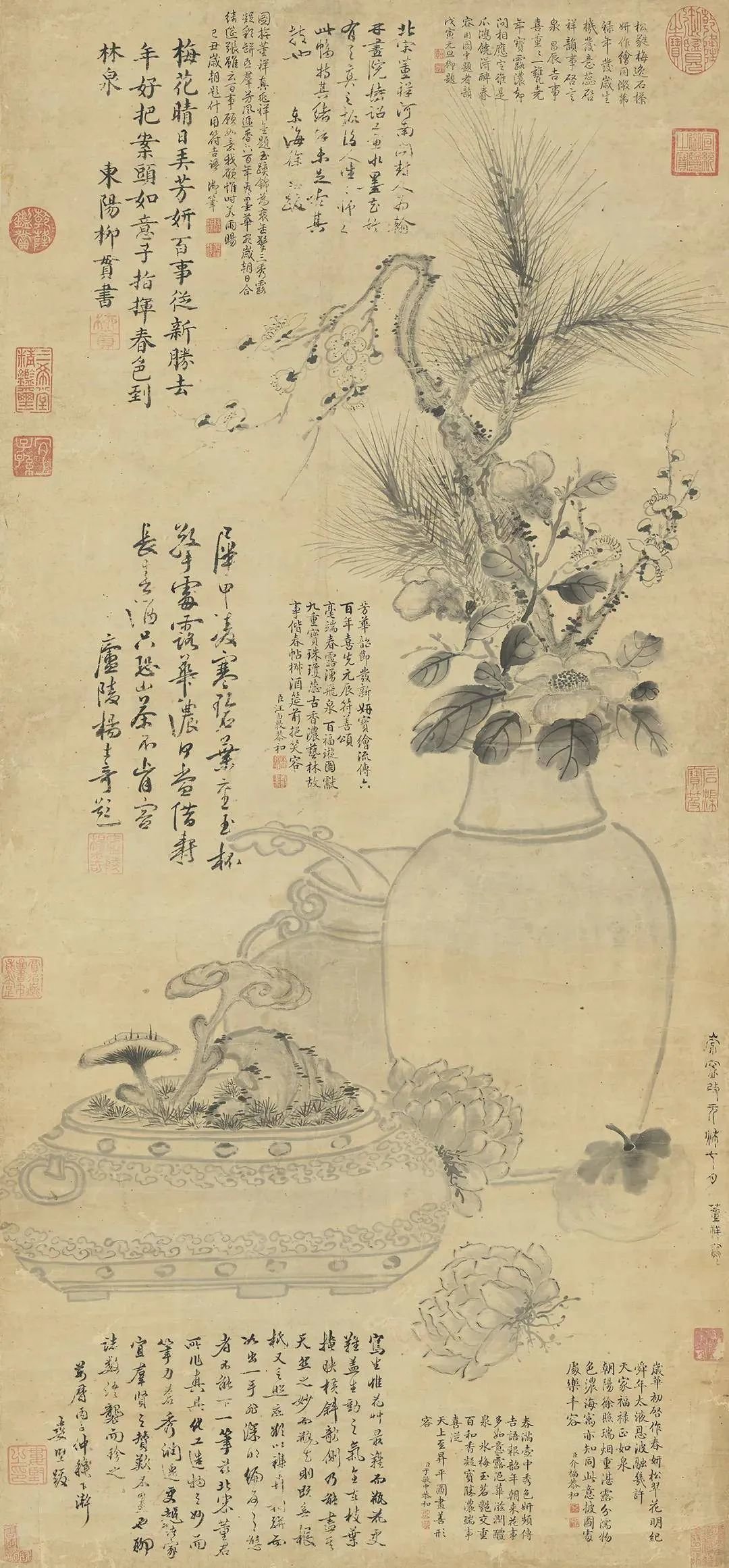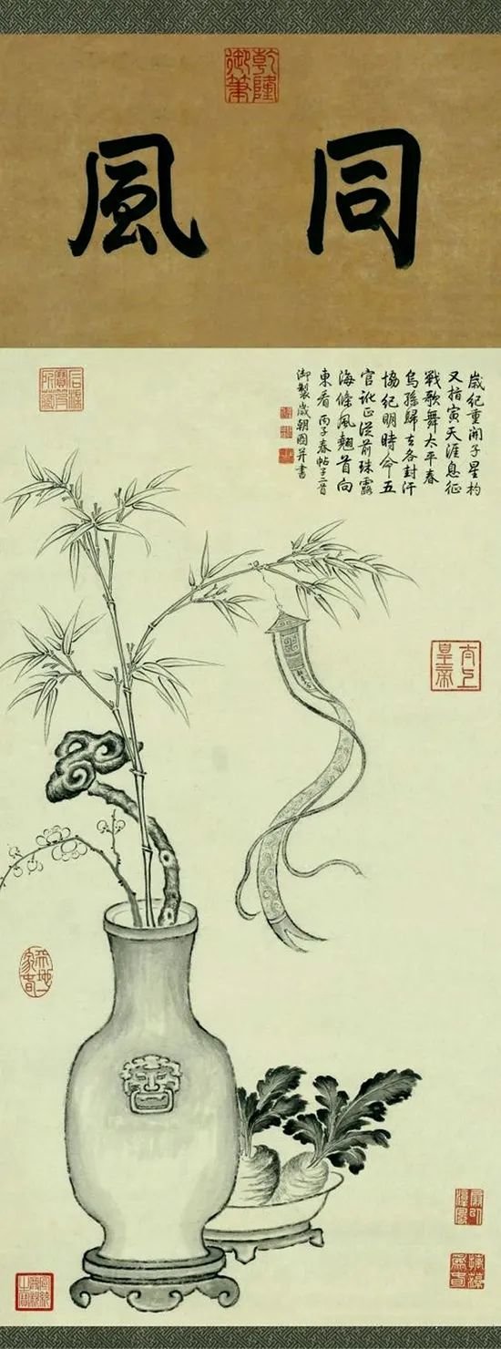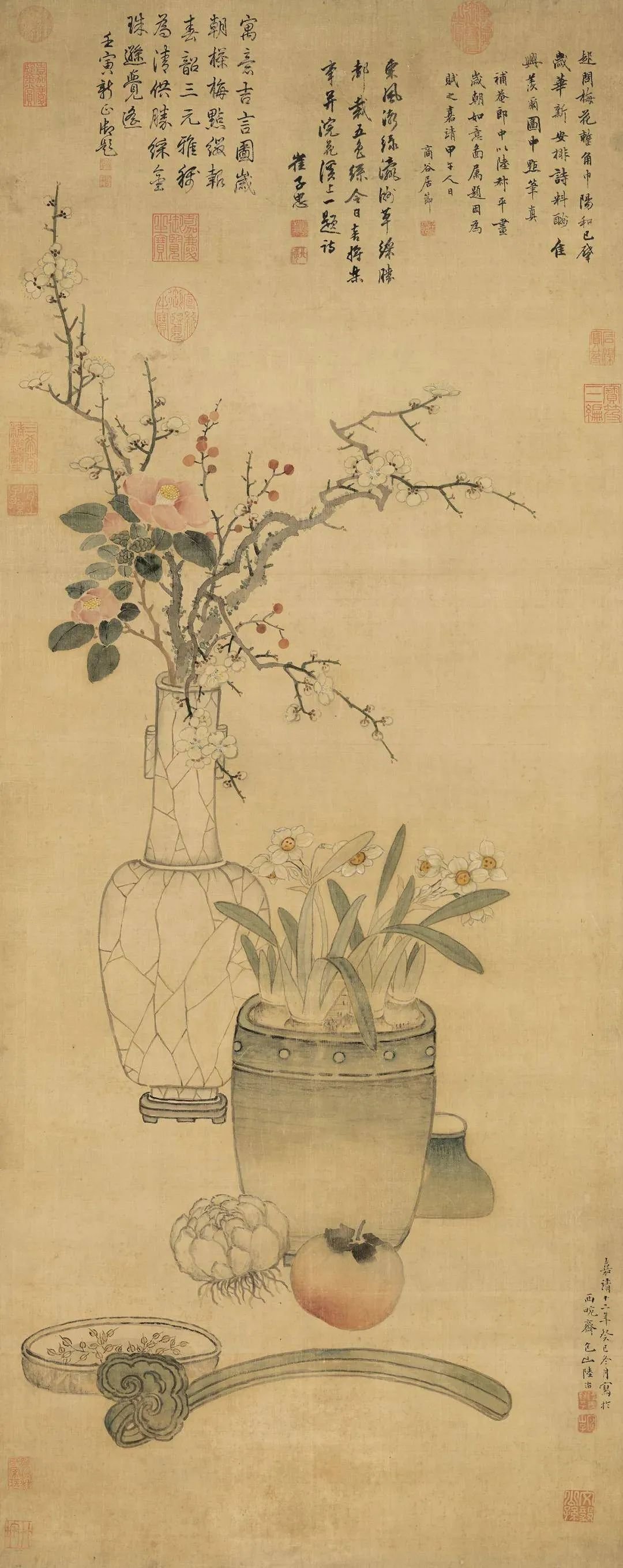 ——所谓“清供”,即在年节以仙花、瑞草、嘉果、奇石、文玩、美器供于案上,供奉天地日月、祖宗社稷,祈求祥瑞之兆同时,亦是值得玩赏的乐事。这类“岁朝图”,画面以瓶花为核心,点缀些许器物,是岁朝最典型的图式。