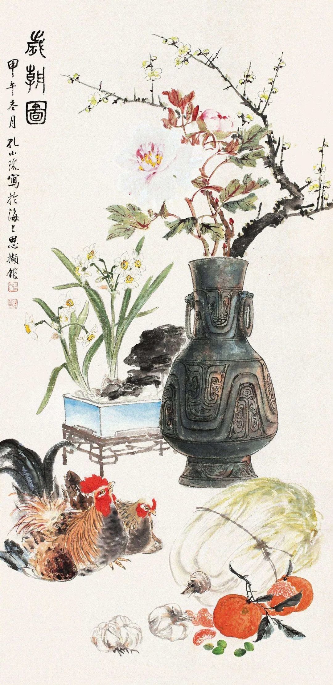 孔小瑜 1954年作 岁朝图 镜片 设色纸本