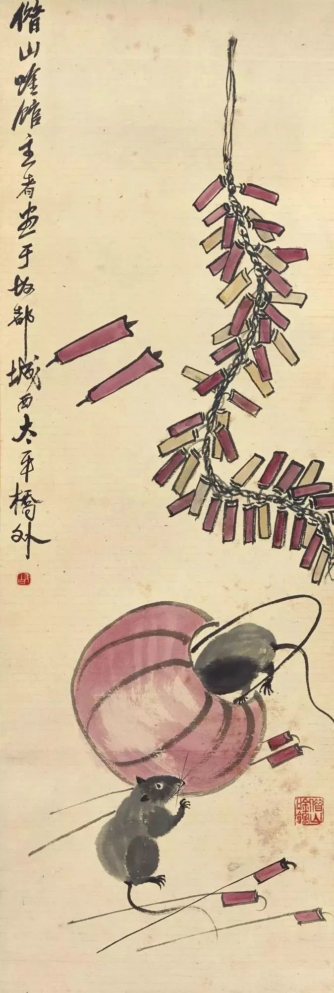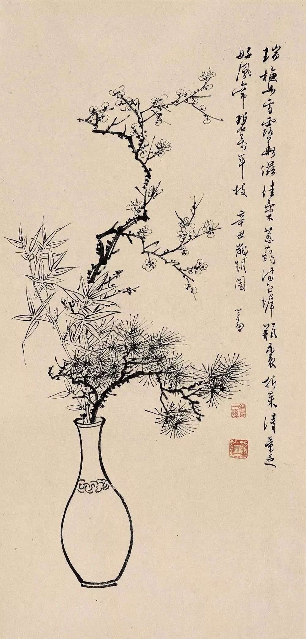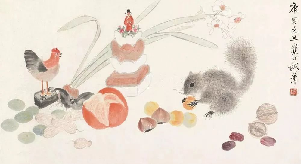 近现代著名画家齐白石先生的《新喜》中的梅花就有报春的意义,而画中的梅花为五瓣,寓意“五福”;清代书画家金农的《岁朝图》中的瓶子中插着的松树枝寓意为“平安长寿”,如果瓶中插着的是梅花则寓意为“平安幸福”;如果是牡丹则寓意为“平安富贵”,瓶子中装荔枝则寓意为“平安吉利”等等。