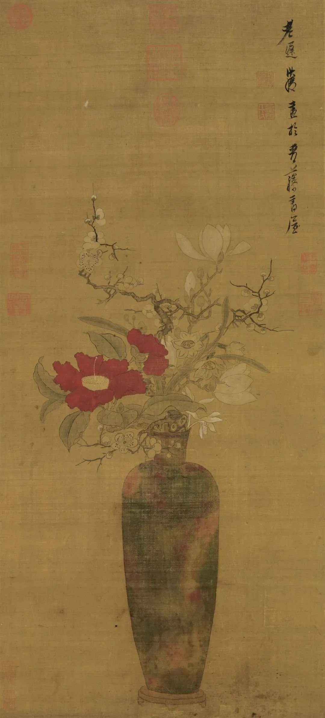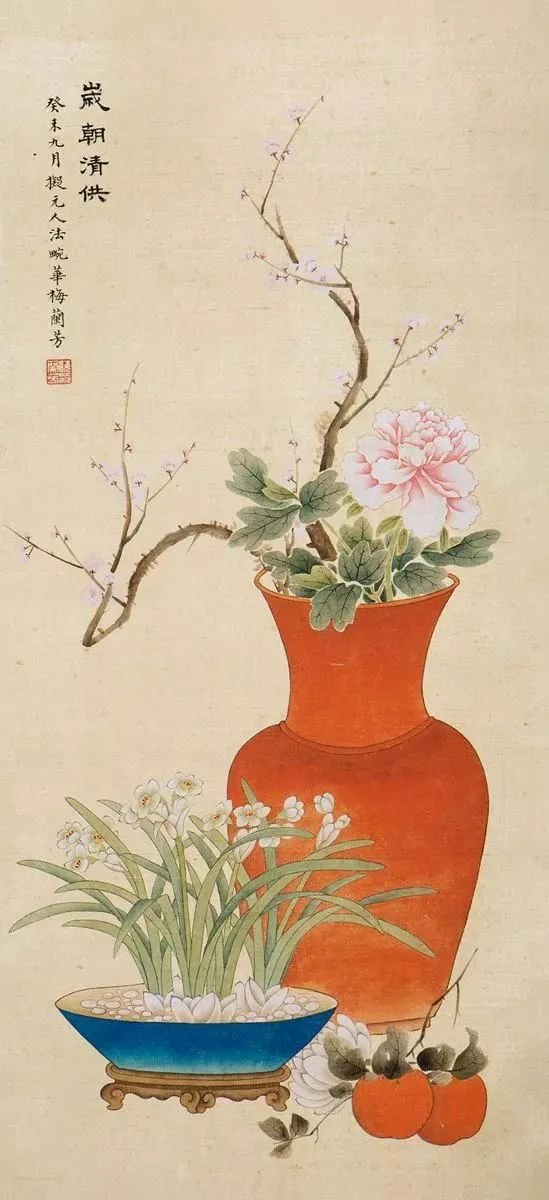 《岁朝图》除了描绘古人过春节的习俗活动之外,还有很多将那些有吉祥寓意的花卉或者器物等作为主题描绘在画中,这些岁朝图的作品被称为“岁朝清供图”。