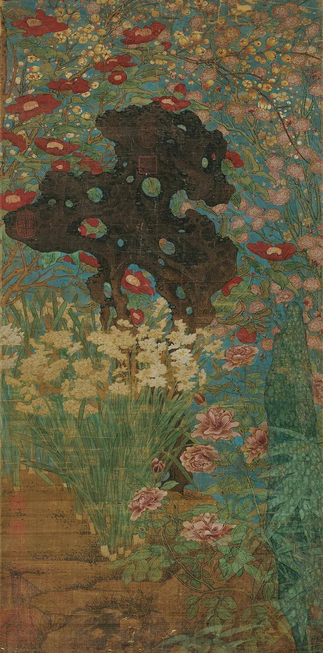 众所周知,宋徽宗赵佶是一个多才多艺的文艺家皇帝,《宋史》评价他“诸事皆能,独不能为君耳”,玩艺术玩到亡了国。他本人不仅书法水平极高(创立了著名的“瘦金体”),而且绘画造诣也相当了得尤其擅长花鸟画,岁朝图也是在他身上发扬光大的。不过,宋徽宗的岁朝图,例如《芙蓉锦鸡图》,主要是通过写生的手法描绘冬天看不到的花卉、禽鸟等用以应景,烘托过年的气氛,还并没有过多的涉及年俗寓意。