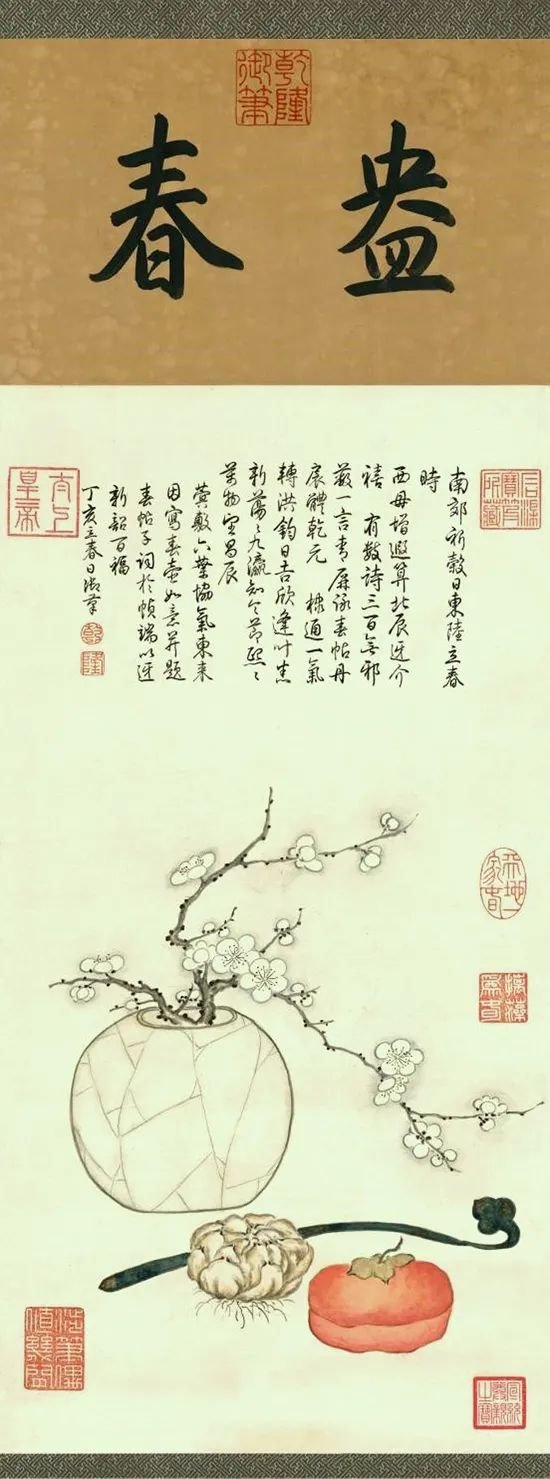 “岁朝”即一岁之始,指农历正月初一。是日,以鲜花、蔬果、文玩供于案前,以求新年好运、春意盎然,被称为“岁朝清供”。《岁朝图》顾名思义,就是为庆贺“岁朝”所作之图,它通常以静物画的面貌出现,并配以贺岁诗词。通过画中物品的名称谐音、民俗寓意或历史掌故,来传达美好的新年祝福。